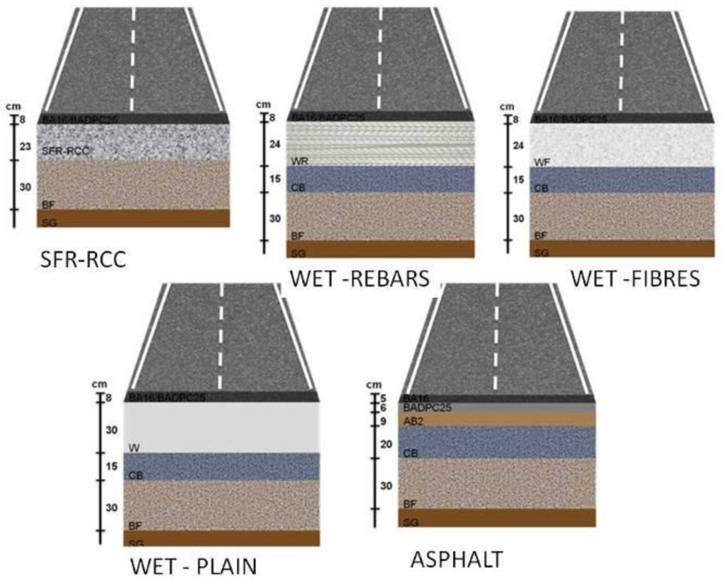 The LCA and LCCA was initially undertaken for the “EcoLanes” demonstration pavement constructed in Cyprus, whose profile is illustrated in Figure 3, and this was followed by a parametric study carried out to assess the effects of design parameters on the LCA and LCCA outputs of the proposed pavement type. Life cycle results include, in addition to the parametric study output, a comparison of a steel fibre-reinforced roller-compacted concrete (SFR-RCC) pavement with four alternatives: one flexible asphalt pavement and three concrete rigid alternatives (see Figure 2). The design of the SFR-RCC was altered in the comparison study to apply in a global scale and not only to the local construction conditions (geological and meteorological variables) [18-20].