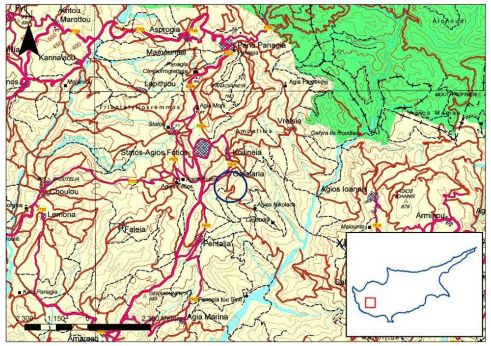 - Neophytou, P.O. Problems in the Specific Environment (Cyprus)—Section of the Old Road to Galataria Village—F624; WP7 (Demonstrations in an Eastern Mediterranean Environment) Deliverable Report 7.1b, FP6 EU STREP Project EcoLanes (031530); 2008; p. 92. [Google Scholar]