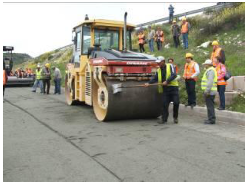 The SFR-RCC was transported by insulated trucks (covered for the duration of the trip to avoid any moisture loss due to high temperatures and wind effects) and fed into an asphalt paver, which placed the material in a single 30 cm-thick layer along the whole transverse road width.