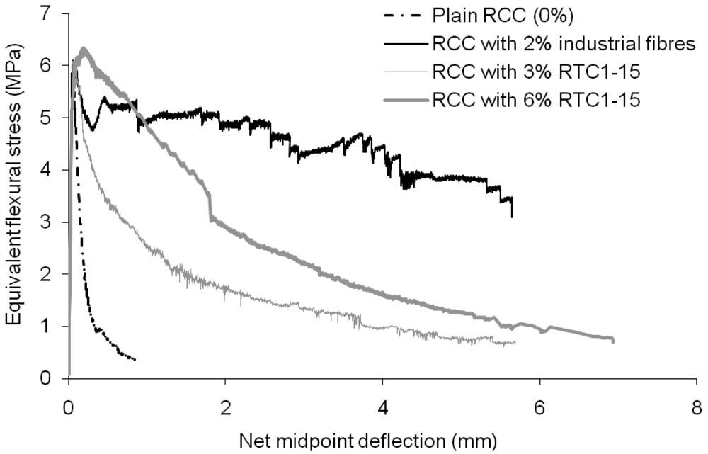 The experimental results confirmed that the mechanical behaviour of wet- and dry-consistency concrete (especially flexural strength and toughness) is improved by the addition of steel fibres. The results indicated that industrially-produced steel fibres are more efficient at reinforcing concrete than RTC fibres (Figure 7). However, it was shown that RTC fibres have the potential to offer a viable alternative to the industrially-produced steel fibres, if used in high amounts (e.g., 6% by mass of concrete) or blended with industrially-produced steel fibres. In addition, it was indicated that the flexural behaviour of dry-consistency SFRC mixes (i.e., SFR-RCC), made with recycled concrete aggregates, is equivalent to the one obtained from SFR-RCC mixes made with natural aggregates [6,27].