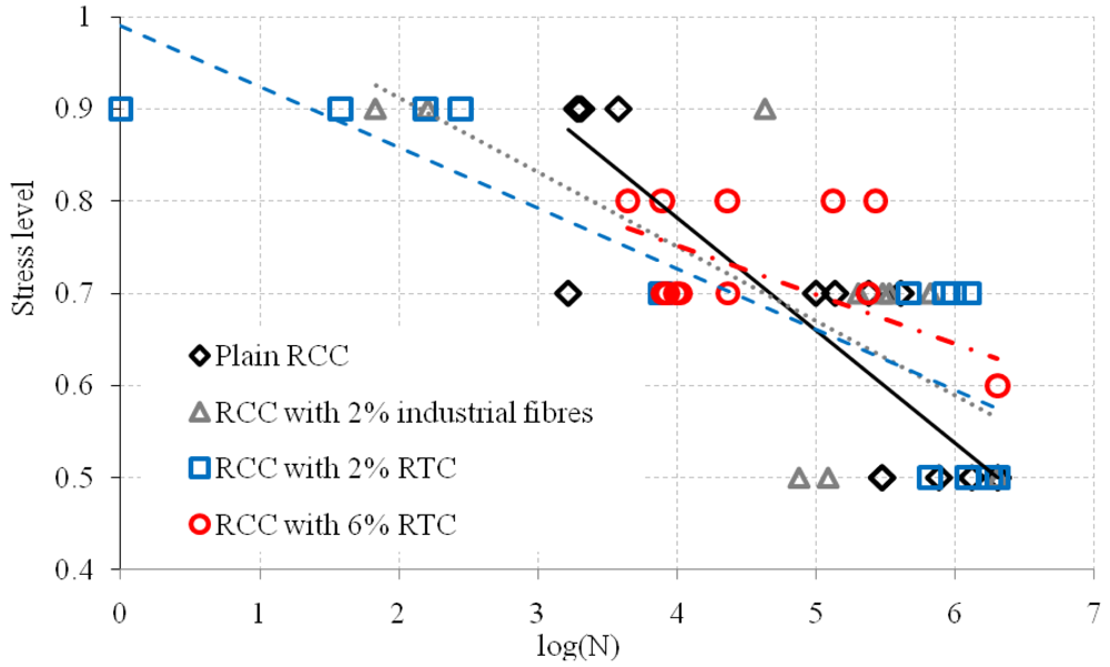 Results of fatigue bending tests of SFRC prisms, carried out for both wet- and dry-consistency SFRC mixes, showed that dry-consistency SFRC containing 2% (by mass) RTC fibres has better fatigue performance than plain dry-concrete (especially at stress levels below 0.7 as shown in Figure 8) [28,29].