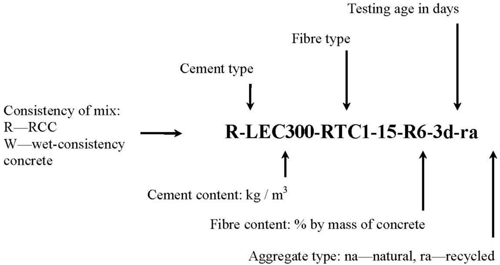 Figure 9 illustrates the terminology used to describe the mix designs shown in Table 4. The first tem R or W is for dry (i.e., RCC) or wet concrete respectively. The second term is the cement input (LEC is for low energy cement) including the quantity in kg. The third term is the fibre type where I2C1/54 is for industrial steel fibres and RTC is for recycled steel fibres. The fourth term is the fibre content in % by mass of concrete. Finally, the testing period in days and whether natural or recycled aggregates were used in concrete production are identified.
