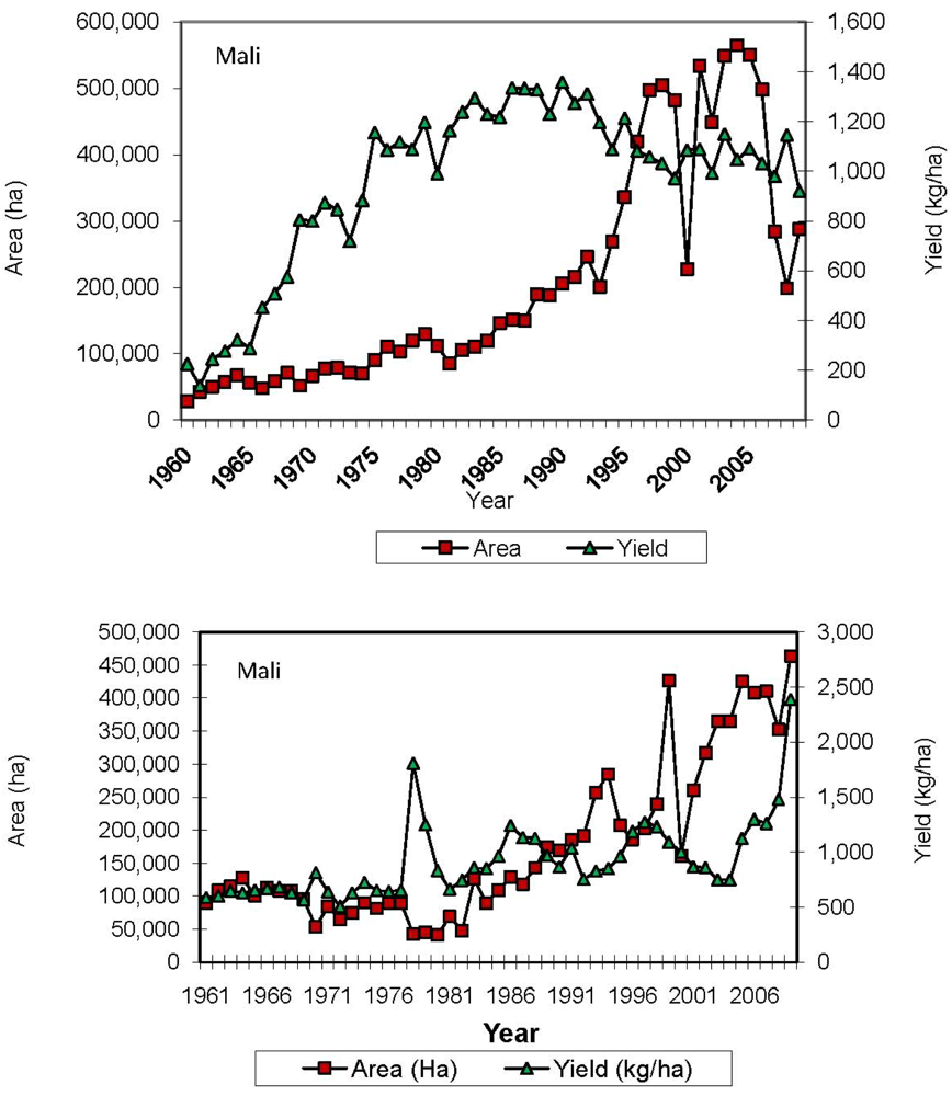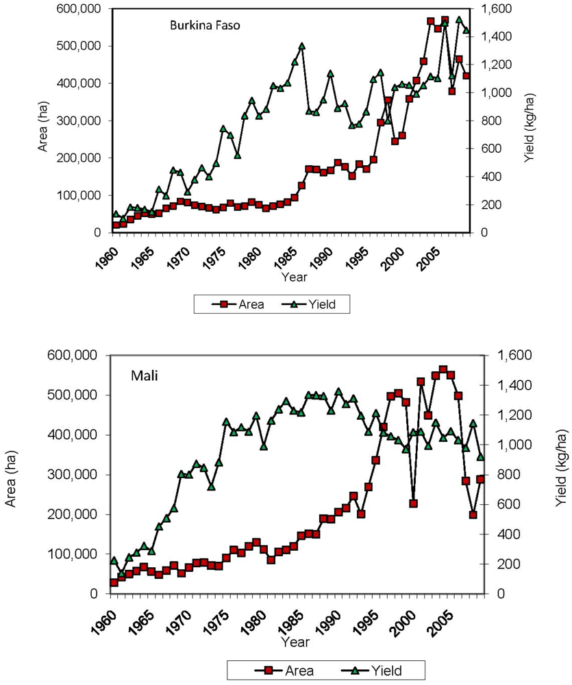 The initial success and achievements of the 1960s and 1970s waned, however, as the sector matured and cotton technology generated increasingly marginal returns [1,2]. Cotton yields peaked in the late 1980s throughout most of West Africa, and over the past few years cotton yields have begun a gradual decline in Mali and Burkina Faso (Figure 1). The causes of the yield stagnation in West Africa can be explained by several factors, including agronomic constraints from pest damage and poor soil fertility management, but yields have also been negatively impacted by lack of varietal development, outdated and improper technology packages, the expansion of cotton production into marginal areas where yields are inherently lower, and climate change [17]. Beginning in the mid-1980s, when the downward trend in yields became first evident, the national cotton companies responded by pushing back the agricultural frontier, expanding into marginal production areas (Figure 1). While the land expansion strategy increased aggregate production in the short-run, average yields continued to stagnate and even fall into the 1990s and through to the present (Figure 1). Moreover, the expanded use of marginal lands has increased environmental concerns since the newly introduced lands are typically located in environmentally sensitive areas where exposed soils are prone to erosion and degradation.