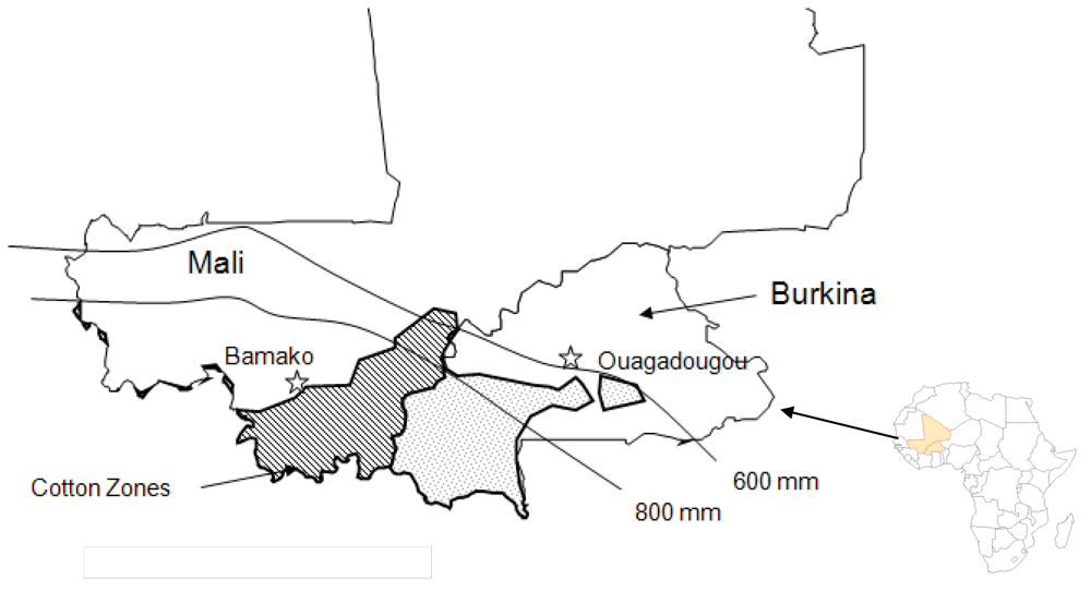 Cotton production in Burkina Faso occurs primarily in the Sudanian and Sudano-Guinean agro-ecological zones, similar to the pattern of cotton production in neighboring Mali (Figure 2). The Sudanian cotton zone was the traditional base of cotton production in the region where it was concentrated during the French colonial period, but over the past three decades it has spread into the Sudano-Guinean zone to the south (Bassett 2001) [1]. Both of those agro-ecological zones are able to support rain-fed cotton production, with average annual rainfall of 600–800 millimeters (mm) in the Sudanian zone and average annual rainfall of 800–1100 millimeters in the Sudano-Guinean zone. Virtually all of the cotton produced in Burkina Faso is grown by smallholder farmers (OECD 2006) [6]. In Burkina Faso, the average cotton producer farms about 3.8 ha of cotton (Baquedano et al. 2010) [8]. Cotton is produced in a three year rotation with cotton grown in the first year, followed by successive years of a cereal crop such as maize, sorghum, or millet.