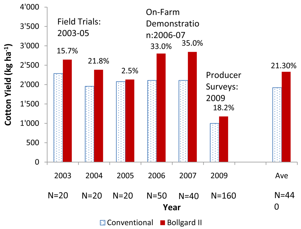 Based on six years of field trials and on-farm monitoring in Burkina Faso, Bollgard II has generated yields that averaged 21.3% higher than yields from conventional cotton (Figure 4). The extremes in Bollgard II yield advantage ranged from a low of 2.5% in 2005 to a high of 35.0% in 2007 (Figure 4). When tested under confined field conditions for three years (2003–2005), Bollgard II generated yields that were 14.7% higher on average than the local cotton varieties. These were important tests since they represented the first testing of Bt cotton under actual conditions in West Africa (Vitale et al. 2008a) [63]. The strong technical performance of Bollgard II over conventional cotton permitted the further testing of Bt cotton under less restrictive conditions. In the following two years, 2006 and 2007, Bollgard II was tested under monitored on-farm conditions at 10 sites throughout Burkina Faso. Results found that Bollgard II obtained higher cotton yields than the three years of field trials conducted in the previous three years, with an average yield of 34% over the two years of on-farm trials (Figure 4).