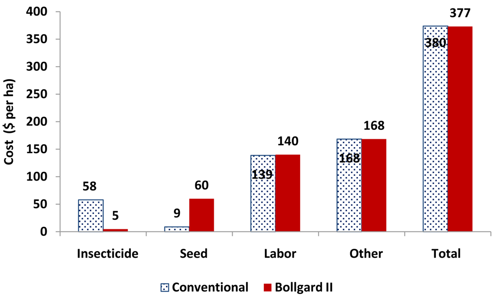Production costs in the first year of commercial introduction were nearly identical between Bollgard II and conventional cotton (Figure 6). Bollgard II cotton had an average production cost of $377 per ha, which was $3 per ha lower than the production cost of conventional cotton, $380 per ha, but Vitale et al. [64] report that the difference was not statistically significant (P > 0.10). This is an important finding since critics of biotechnology sometimes argue that seed costs for Bt crops are extreme. In the 2009 production year, although Bt seed was significantly more expensive than its conventional counterpart ($60 per ha vs. $9 per ha), the cost was offset by the savings on insecticide input costs of $53 per ha (Figure 6). Hence, Bollgard II is able to recoup its higher seed cost through an equivalent savings in insecticide and conventional seed costs. When the additional yield realized in Bollgard II is considered, the Bt seed cost is a better investment than the purchase of additional insecticide sprays and conventional cotton. Likewise, labor costs also had components that both increased and decreased cotton production costs. Fewer insecticide sprayings reduced labor costs, but the higher yields obtained by growing Bollgard II resulted in higher harvest costs and no significant reduction in labor costs. While labor cost savings are often cited in the biotechnology adoption literature, they have been reported primarily in the developed country context where opportunity cost of operator time and machinery running costs are greater. For instance, in South Africa both Kirsten and Gouse [72] and Shankar and Thirtle [73] report no significant labor cost savings from Bt cotton due to higher harvest costs that offset the effects of reduced labor in pesticide application.
