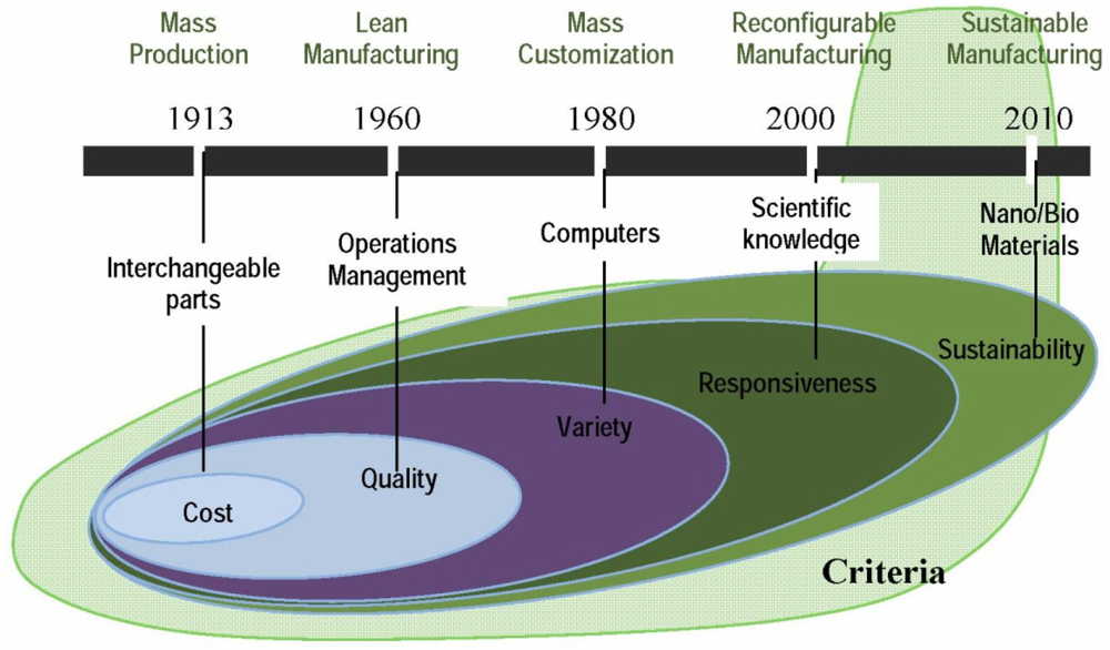 Generally speaking, manufacturing systems become more and more complicated due to the expanded activities and the dynamics of manufacturing environment. The history of manufacturing has been reviewed by many workers [9-13]. As summarized in Figure 1, the scope of customers' requirements on products has been gradually expanded. The earlier markets, before 1913, were short of products and customers cared only about the product's functions. Companies aimed at cost reduction to gain more profit. Since 1960, global manufacturing capabilities became sufficient enough to introduce competition among suppliers. Customers were able to demand more than basic product functions. Therefore, how to improve product quality became the key strategy of success from the 1960s to the 1970s. With an abrupt advancement of information technology (IT) from 1980, global manufacturing markets were gradually saturated; companies were then pressured to manufacture new products at a faster pace to catch earlier marketing opportunities. Today, people are very conscious to the deterioration of the global environment and the predictable shortage of natural resources in near future. Manufacturing companies are forced to change their system paradigms to accommodate the new needs of sustainability. As shown in Figure 1, the evolution of manufacturing system paradigms has been divided into six phases. The symbolized concepts at each phase transition were: ‘mass production’, ‘lean manufacturing’, ‘mass customization’, ‘reconfigurable manufacturing’, and ‘sustainable manufacturing’, respectively [2].