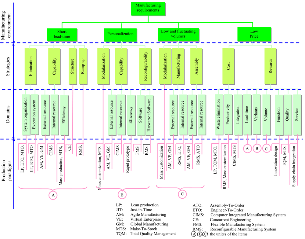 Manufacturing system paradigms involved are: Lean Production, Just in Time, Agile Manufacturing, Virtual Enterprise, Global Manufacturing, Concurrent Engineering, Computer Integrated Manufacturing System, Flexible Manufacturing System, Reconfigurable Manufacturing System, Mass Customization, Make-To-Stock, Total Quality Management, Make-To-Order, Engineer-To-Order, and Assembly-To-Order. Many system paradigms, such as Reconfigurable Manufacturing System and Lean Production, can contribute to multiple requirements in different ways through their implementation. Moreover, it is challenging to surmise that one paradigm is better than another without considering the unique situation of a specific enterprise. All of these system paradigms have their strategies to meet certain requirements in one way or another; while none of them apply all of the strategies simultaneously to meet all requirements.