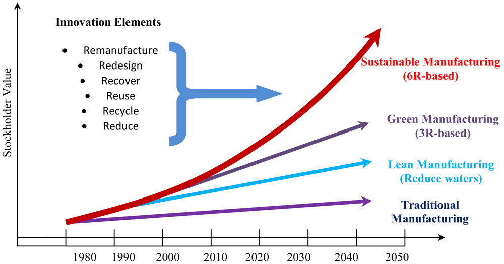 In Figure 2, it has been shown that the existing system paradigms have been developed to meet the requirements of short lead-time, personalization, low and fluctuating volume, and cost reduction. Their capabilities to deal with the requirements of sustainability have to be re-examined systematically. From the viewpoints of manufacturers, the limitations of existing system paradigms to cope with sustainability requirements have been identified [14]. It is worth exploring new system paradigms which can meet the requirements of sustainability effectively. However, for most manufacturing systems, an essential condition for survival is to make profit. Eventually, design criteria of system design can be linked to the increased values of product from a manufacturing system. As shown in Figure 3, the trend of the change of system paradigms has been predicted [15,16]. It is suggested that a new system paradigm must possess the capabilities of 6Rs (Remanufacturing, Reuse, Redesign, Recycle, Recover, and Reduce) to maximize the increased value of products.