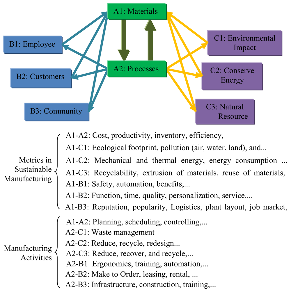 According to the definition of sustainable manufacturing [31], the activities in a manufacturing system can be classified into two types: activities on materials and activities on processes. As shown in Figure 4, these activities have their impact on ‘environment’, ‘economics’, and ‘society’. The manufacturing environment contains the aspects: ‘environmental impact’, ‘conserve energy’, and ‘natural resource’. Society contains the aspects: ‘customers’, ‘employee’, and ‘community’. Various criteria have been identified to evaluate the performances of a sustainable system paradigm.
