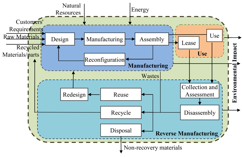 Manufacturers have begun to realize the need for the responsible use and management of resources in the life cycle of product [37]. Manufacturing systems' role in sustainability really relies on how the boundaries of a manufacturing system are defined. As shown in Figure 5, traditional manufacturing systems did not take many aspects into consideration, such as waste management, pollution, recovery and reuse of used products. As shown in Figure 6, with the increasing consciousness regarding environmental problems, many activities have been introduced in the life-cycle of products. Manufacturers have the choice of either including these activities in the operations and optimizing the overall structure based on the required tasks, or paying for the cost to solve the problems of waste management and disposal etc. Therefore, the roles of manufacturing systems depend on the definition of the boundaries of a manufacturing system, and it varies from one company to another. Within the scope of manufacturing, we will discuss further in Section 4 how the paradigm of reconfigurable manufacturing seamlessly fits the goal of system sustainability, i.e., through the reconfiguration of system components, the manufacturing sources can be reused so that the waste from manufacturing can be reduced.