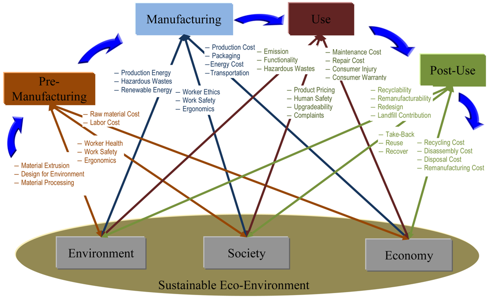 According to the US National Research Council, sustainability is defined as “the level of human consumption and activity, which can continue into the foreseeable future, so that the systems that provides goods and services to the humans, persists indefinitely”. Interactions within and across these levels is critical to the fundamental understanding of sustainable manufacturing systems [28]. Sustainable Manufacturing is developing technologies to transform materials without emission of greenhouse gases, use of non-renewable or toxic materials or generation of waste [29]. Sustainable systems are characterized by interlinked interactions at various levels spanning economic, ecological and societal issues [30].