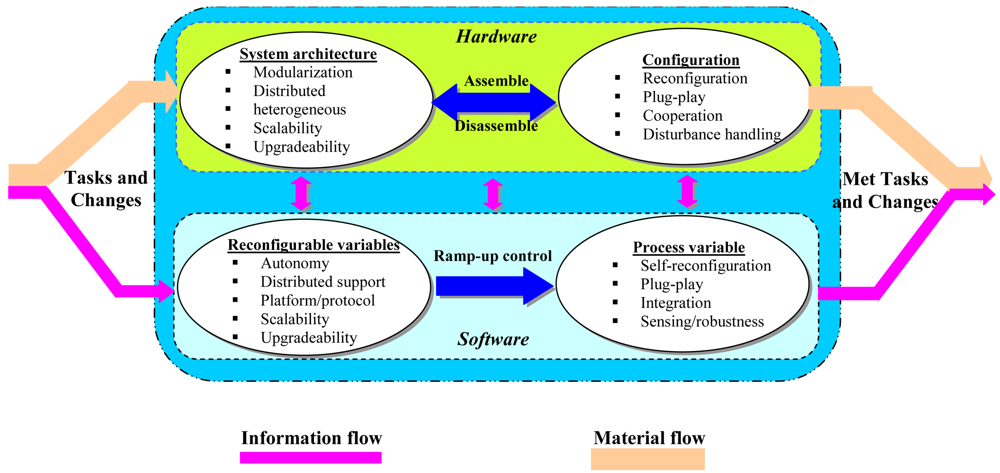 In an RMS, system reconfigurability can be classified in terms of the levels where the reconfigurable actions are taken. Reconfigurability at lower levels is mainly achieved by changing hardware resources, and reconfigurability at the higher levels is mainly achieved by changing software resources and/or by choosing alternatives methods or organizations. The resources at different levels must work together so that system reconfigurability can be maximized cost-effectively. As shown in Figure 8, an RMS consists of a reconfigurable hardware system and a reconfigurable software system. The hardware system includes reconfigurable machining systems, reconfigurable fixturing systems, reconfigurable assembly systems and reconfigurable material-handling systems [7]. RMS characteristics include ‘modularity’, ‘scalability’, ‘integrability’, ‘convertibility’, and ‘diagnosability’ [12]. From the perspective of sustainability, the relevant objectives of RMSs are (i) to reduce the wastes through the reuse of manufacturing resources and (ii) to reduce energy cost through the optimization of manufacturing processes and system reconfiguration. Numerous researches have been published on design and control reconfigurable systems to achieve these two objectives. For example, some previous works by this author on design and control of RMSs have been reported in literatures [38-44].