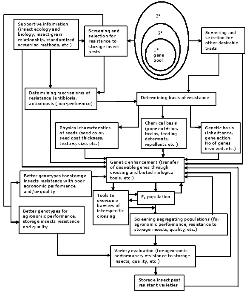 The major sources of genetic variation for improving resistance against storage insect pests, like many other biotic stresses, include germplasm collections from local sources, introduction and acquisition of germplasm from exotic sources and recombinants resulting from crossings of selected parents of all sources. The basic selection methods (i.e., mass, bulk, pedigree and backcross methods, etc. or their modifications) may be applied depending on the mode of inheritance and the number of genes controlling resistance under a given condition.