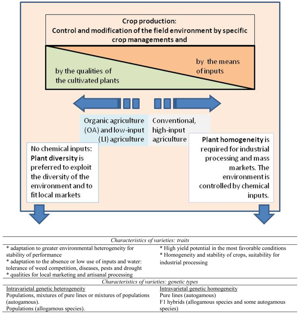 Figure 1 illustrates the strategies used to optimize organic and conventional systems: the first one is based mainly on the choice of plants and the other is mainly based on the proper use of inputs. All intermediate situations are possible in which a balance is established between plant adaptation and inputs. Because professional breeding has primarily targeted conventional agriculture, available varieties on the market present several shortcomings in regards to the aims of organic agriculture. The vast majority of commercial varieties are genetically homogeneous: pure lines for autogamous species, F1 hybrids for allogamous species and F1 hybrids for many autogamous vegetable species. Resowing seeds resulting from the crop of these commercial varieties either will not give a proper crop in the case of F1 hybrids, or is subjected to a fee for pure lines in some European Union (EU) countries, such as in France. Furthermore, there are very few varieties specifically bred for organic and low-input conditions. This is the case for spinach, the crop under discussion in this article [4]. Finally, using little or no chemicals asks for more resilience from the varieties in order to best exploit environmental conditions. Therefore, due to the specific conditions of OA (great variability of the environment, agronomic practices, end-uses, markets), farmers would like to tailor the varieties to their needs through exchanges with other farmers and selection in their fields. In the case of OA, genetically diverse varieties can benefit from on-farm participatory plant breeding [5-9] in addition to classical breeding, even when classical breeding is conducted under organic conditions.