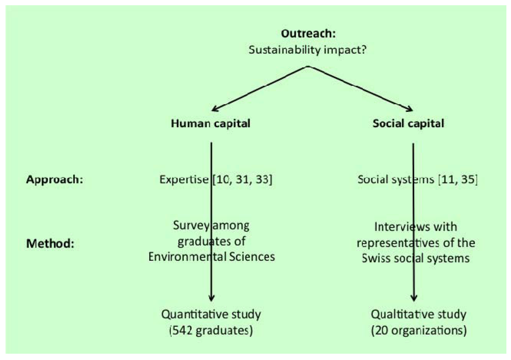 We used the concepts of human and social capital for the assessment of the outreach of twenty years of the Environmental Sciences educational program at the Swiss Federal Institute of Technology in Zurich. As the program is based on the principles of sustainable development, the focus of the outreach assessment was on its sustainability impact. What was—in terms of human and social capital—the contribution of the Environmental Sciences educational program to sustainability in Switzerland? What does this case teach us about functional forms of human and social capital of sustainability outreach in general?