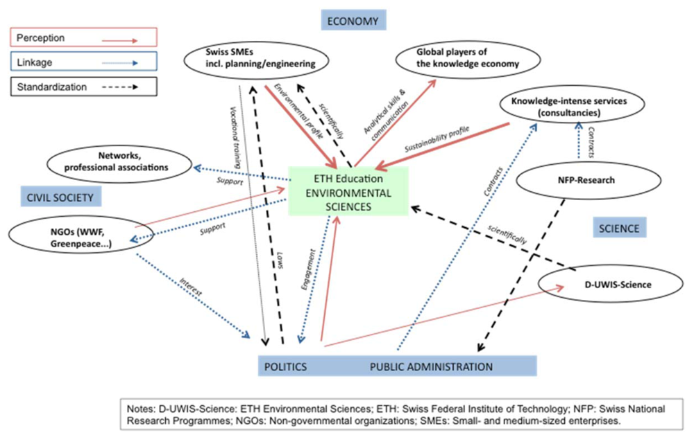 For an operationalization, we followed the approach of expertise as human capital [9,10]. Social capital was assessed within a social systems approach [11]. For our outreach study, we combined quantitative and qualitative methods. We found that besides the “production” of skilled people—or human capital [4]—a major part of the outreach of Environmental Sciences education in Switzerland rested on increased social capital, namely the definition and proliferation of standards for understanding human-environmental systems. However, we also found a divide between the public perception of the educational program and that of the conducted research by ETH Environmental Sciences.