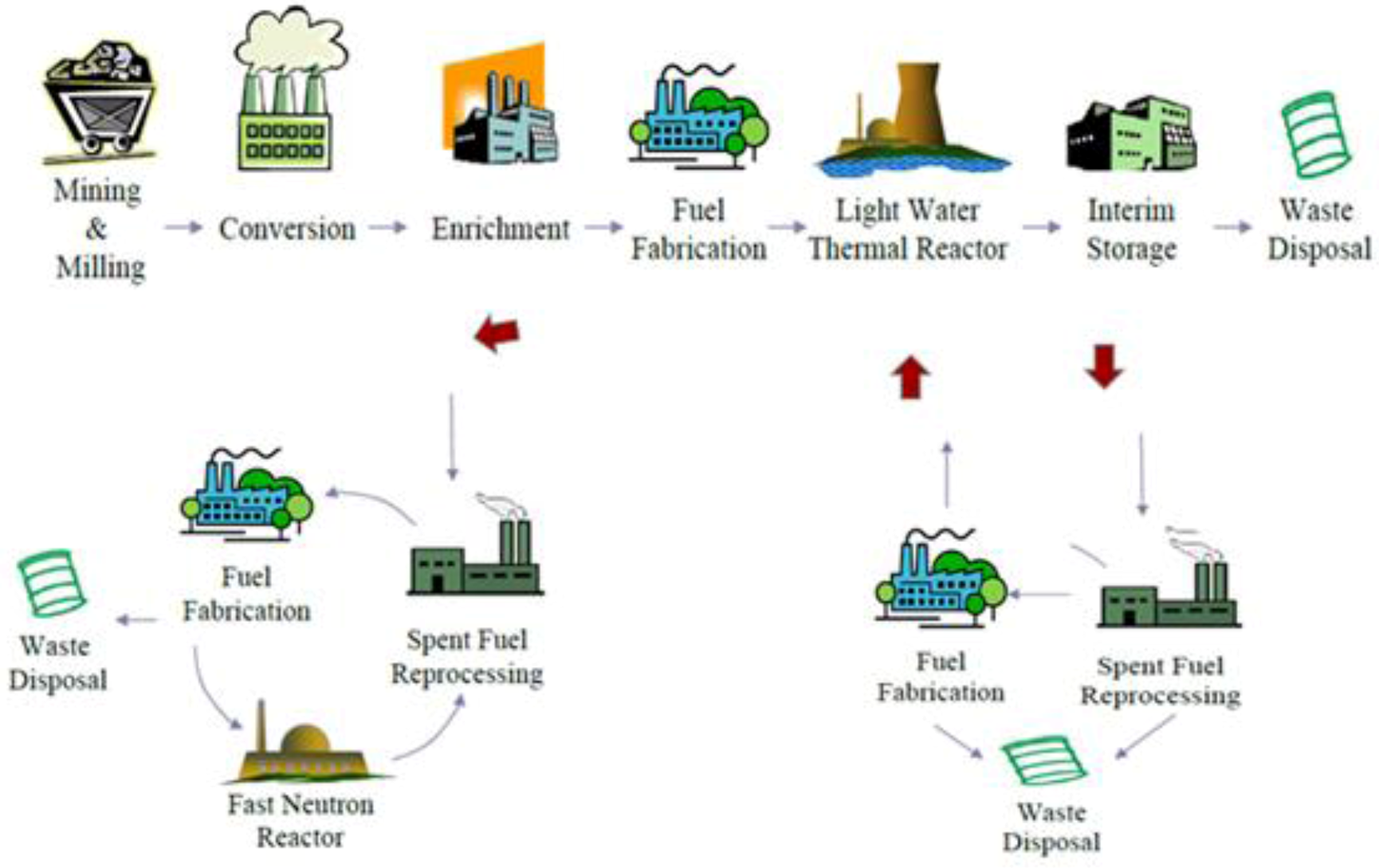 Since the beginning of application of nuclear energy for civilian electricity supplies, several issues related to its deployment were identified: sustainability (both on the resource supply as well as on the treatment of used fuel to extend the supply of energy), health and environmental impact, proliferation of materials useable as weapons and economic competitiveness became part of an intense and continuous debate around this energy source. Despite more than 50 years of experience and many technological improvements, the same issues are still debated today in comparing nuclear energy to other energy sources and in optimization of the energy portfolio of developed and developing countries [1,2]. To properly address those issues, however, it is necessary to study not only the performance of nuclear reactors per se, but also of the entire system in which they are expected to operate, namely the corresponding nuclear fuel cycle (see Figure 1). Such an analysis should model and represent all the individual stages of the nuclear fuel cycle as well as the interactions between them.