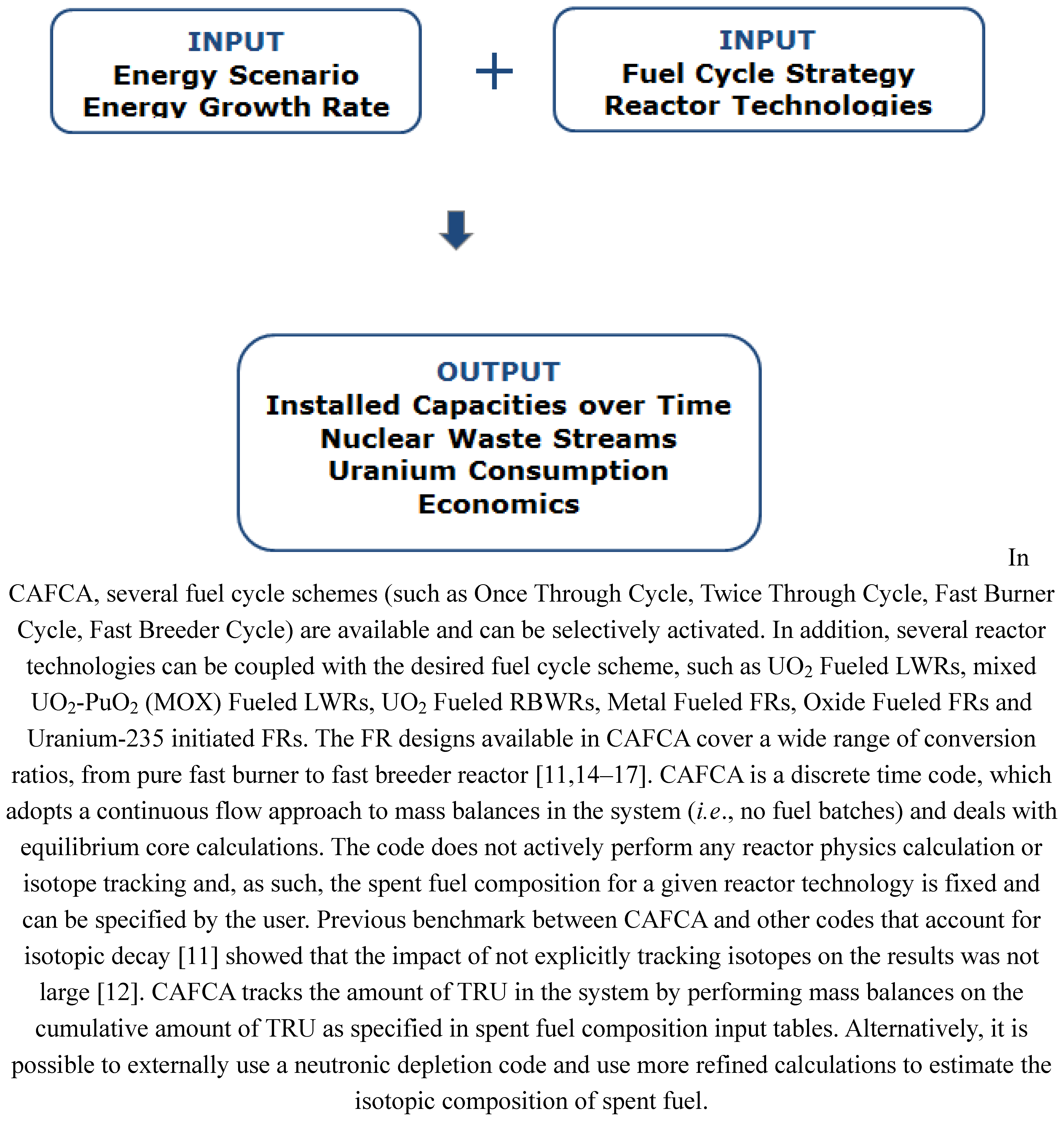 Over the past ten years a tool for nuclear fuel cycle dynamic analysis, named CAFCA (Code for Advanced Fuel Cycle Analysis) has been developed at MIT. The current version is coded in the System Dynamics-VENSIM platform and is the systems analysis tool used to produce the results reported in the MIT Nuclear Fuel Cycle Study [9,10]. CAFCA has been the object of an extensive benchmarking exercise together with other state of the art nuclear fuel cycle analysis codes [11,12,13]. The nuclear fuel cycle model built in CAFCA includes non-linear connections, feedback loops and constraints typical of complex systems evolving over time. As inputs, CAFCA accepts assumptions on the energy scenario to be simulated (in particular the nuclear energy demand growth rate) as well as on the fuel cycle strategy and the reactor technologies assumed to be available for the specific scenario. As outputs, CAFCA provides several data and metrics of interest in nuclear fuel cycle analysis, such as: the installed capacities over time of the available reactor technologies, nuclear waste streams, uranium consumption, economics, etc. (see Figure 2).