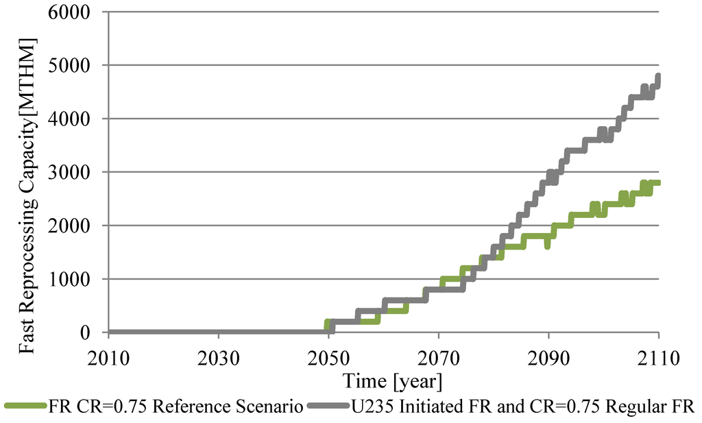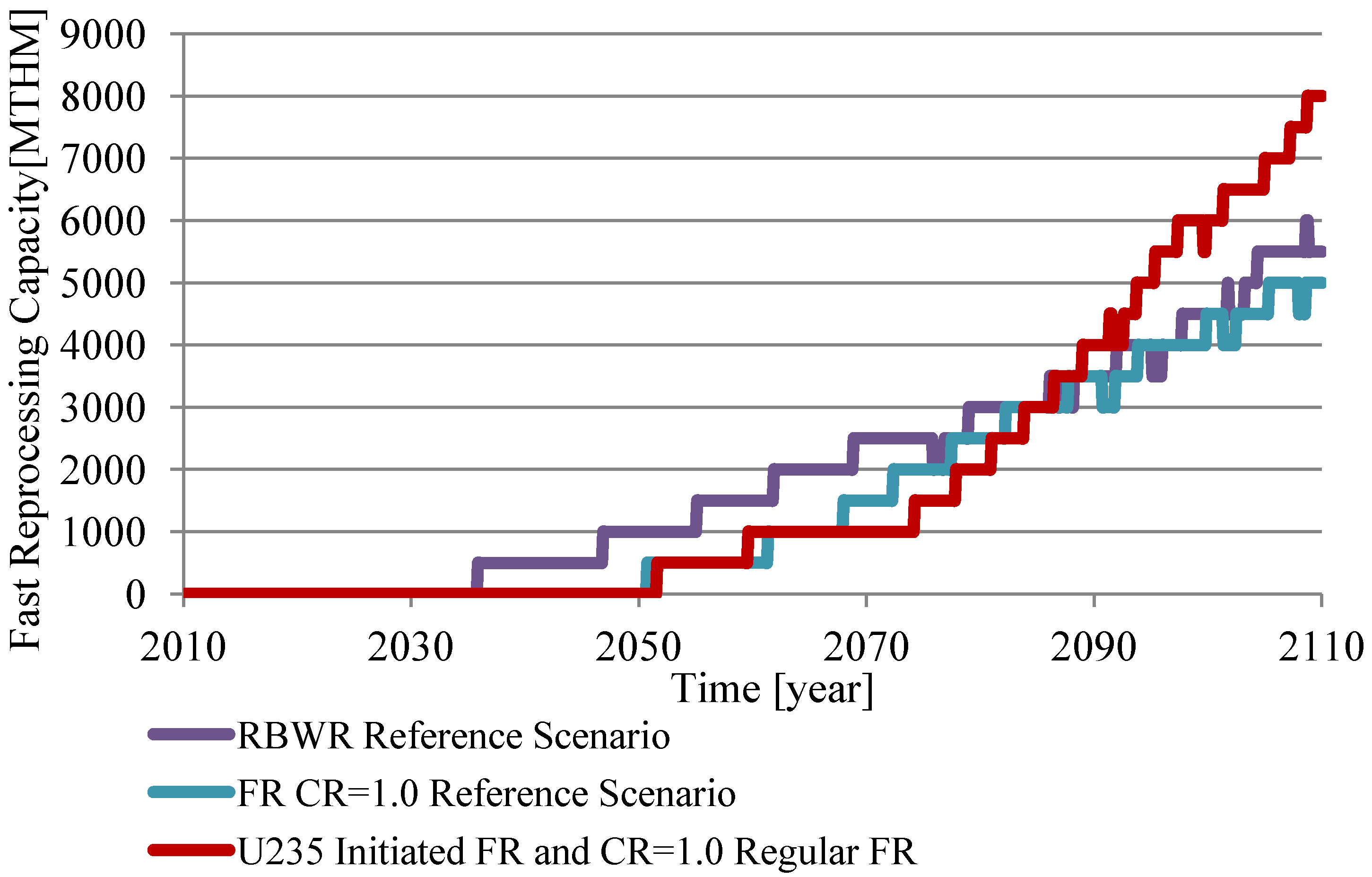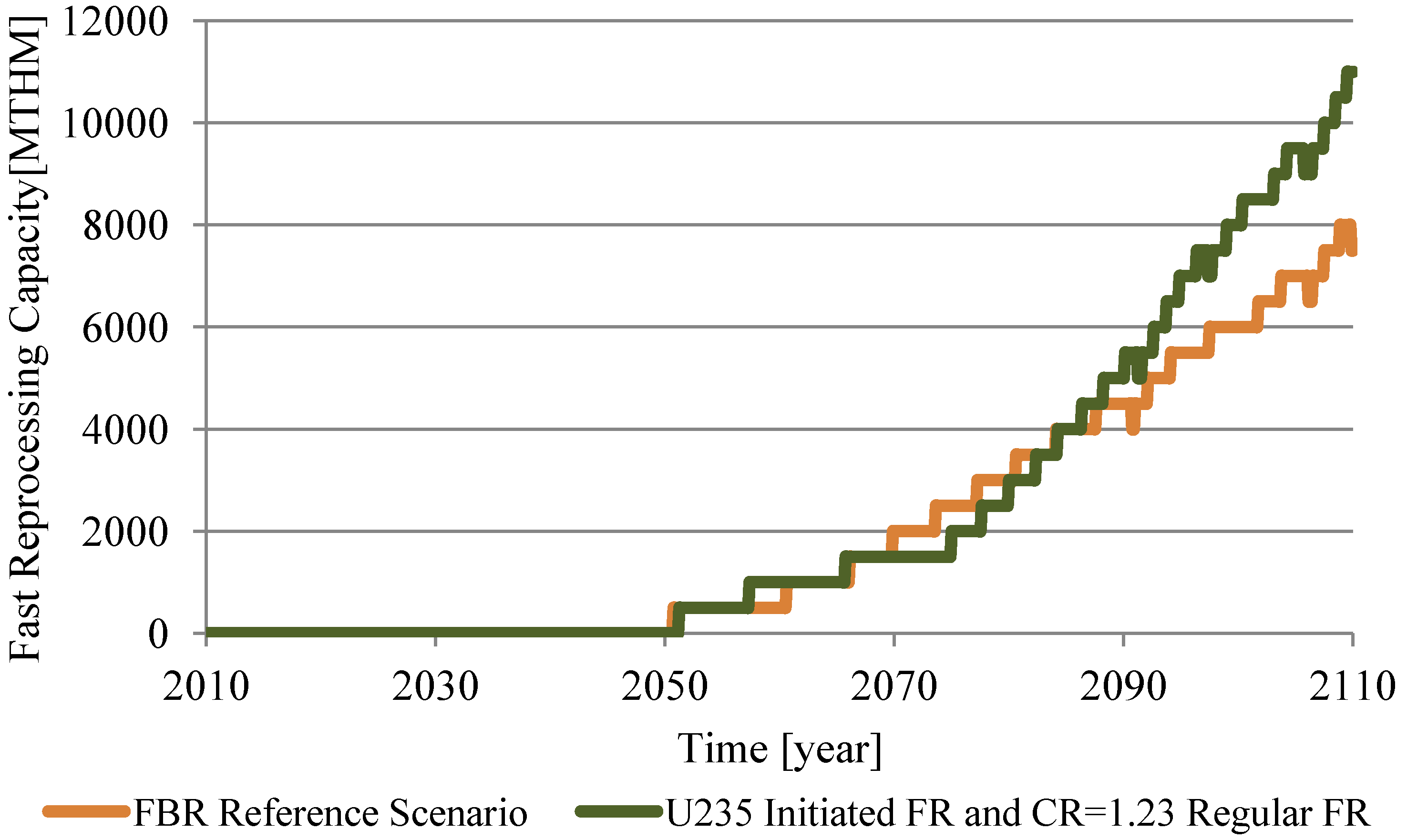 As expected, by switching to U-235 initiated FRs, the need for thermal reprocessing is reduced, while more fast reprocessing facilities are needed to reprocess a much larger amount of spent fast reactor fuel compared to the conventional fast reactor scenarios.
