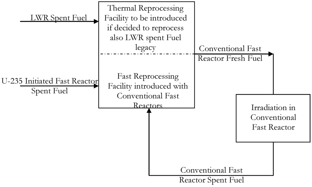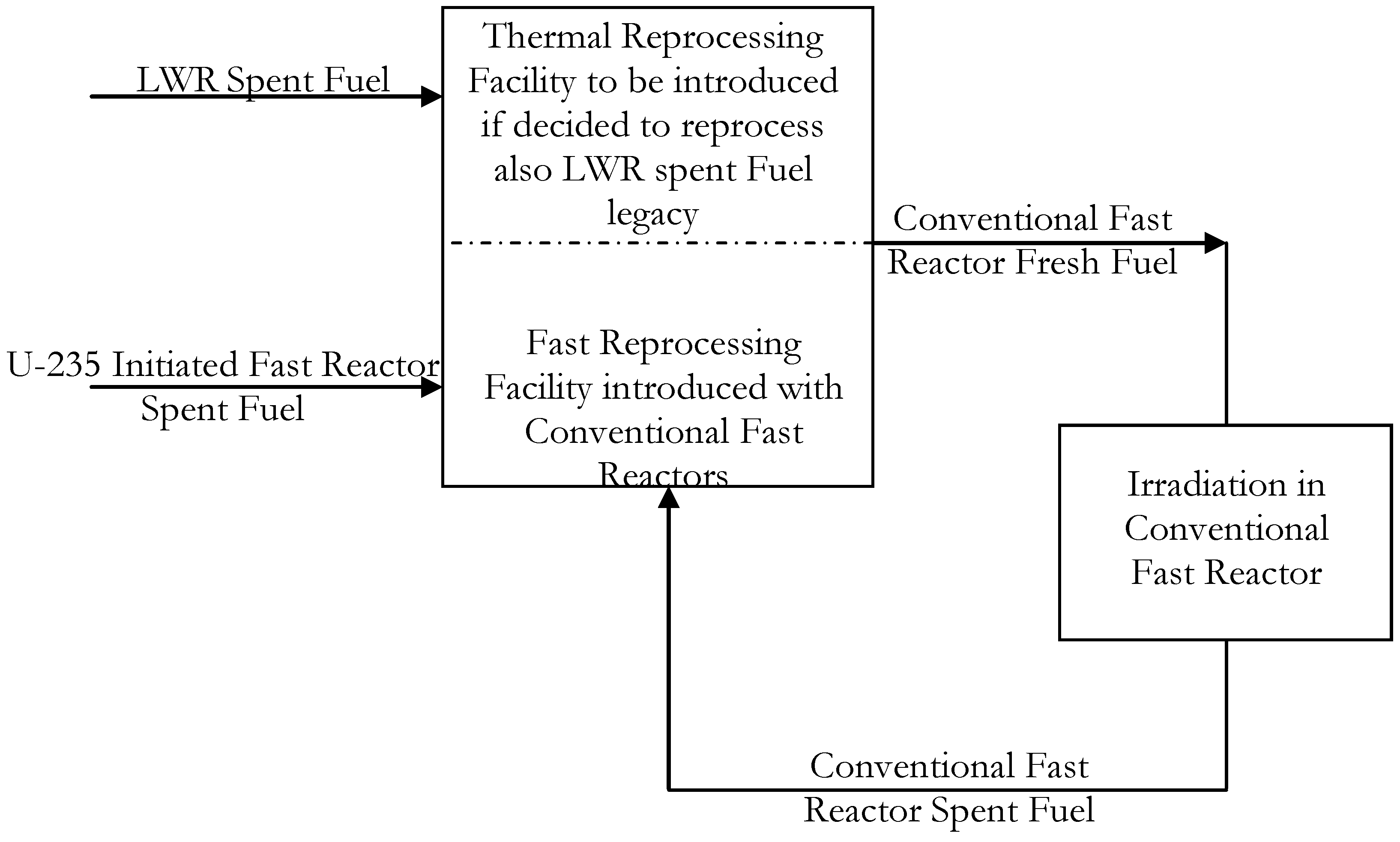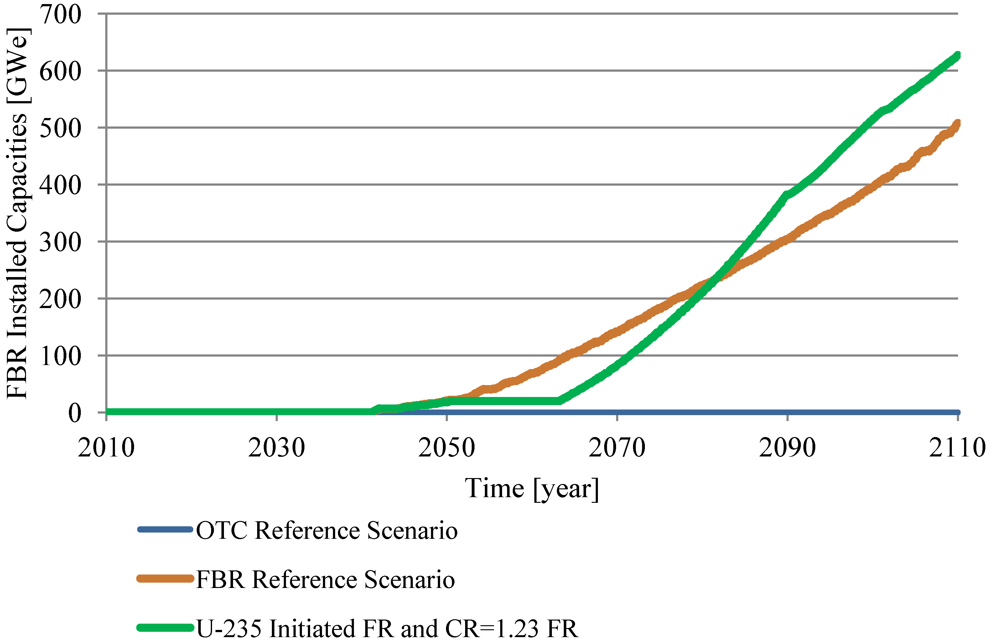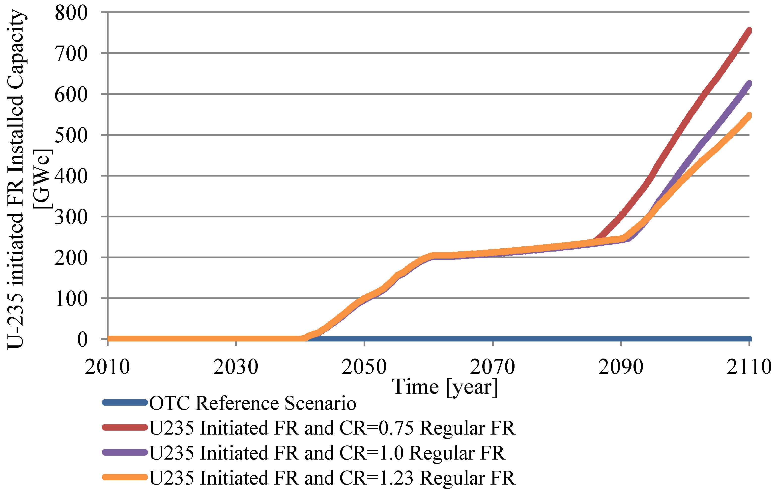 As expected, by switching to U-235 initiated FRs, the need for thermal reprocessing is reduced, while more fast reprocessing facilities are needed to reprocess a much larger amount of spent fast reactor fuel compared to the conventional fast reactor scenarios.