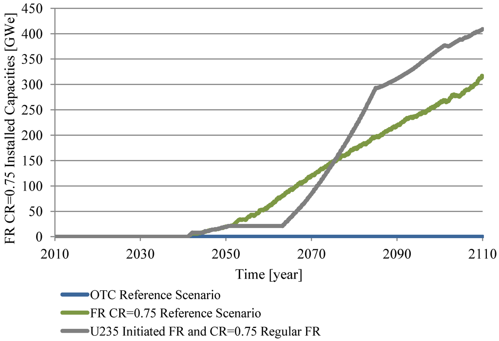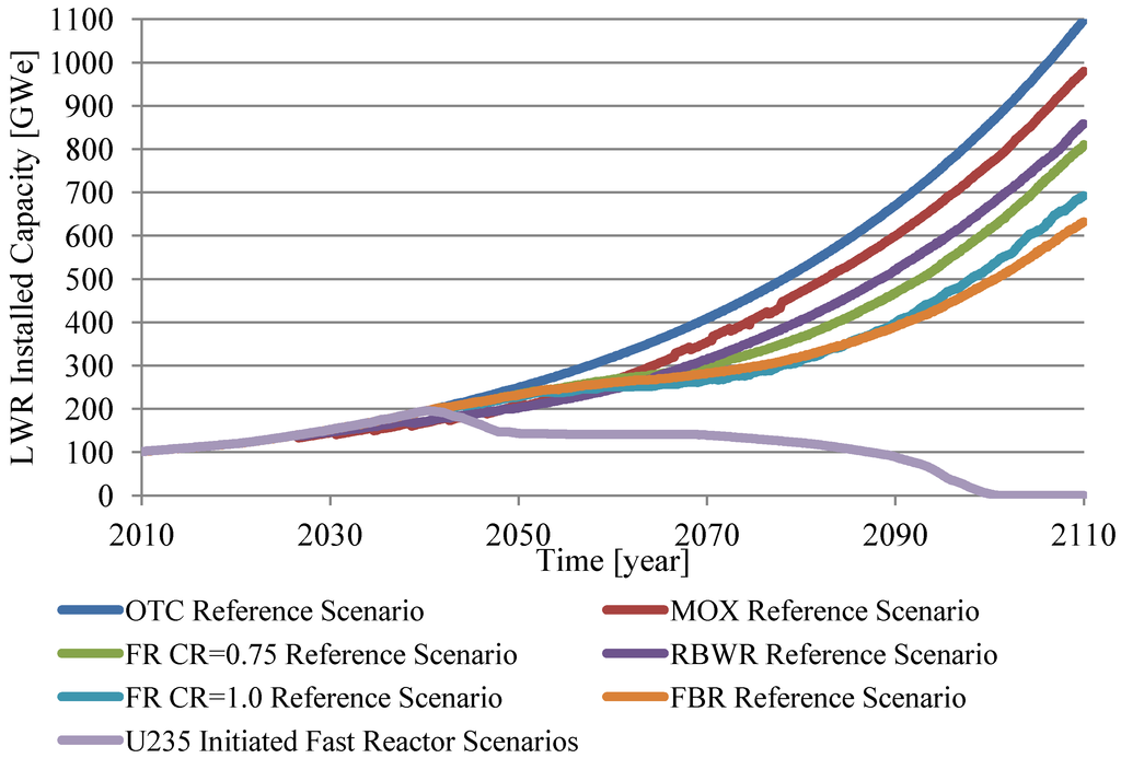 | LWR-UO2 installed Capacity (GWe) | FR CR = 0.75 installed Capacity (GWe) | FR CR = 1.0 installed Capacity (GWe) | FR CR = 1.23 installed Capacity (GWe) | U-235 FR Installed Capacity (GWe) | ||||||