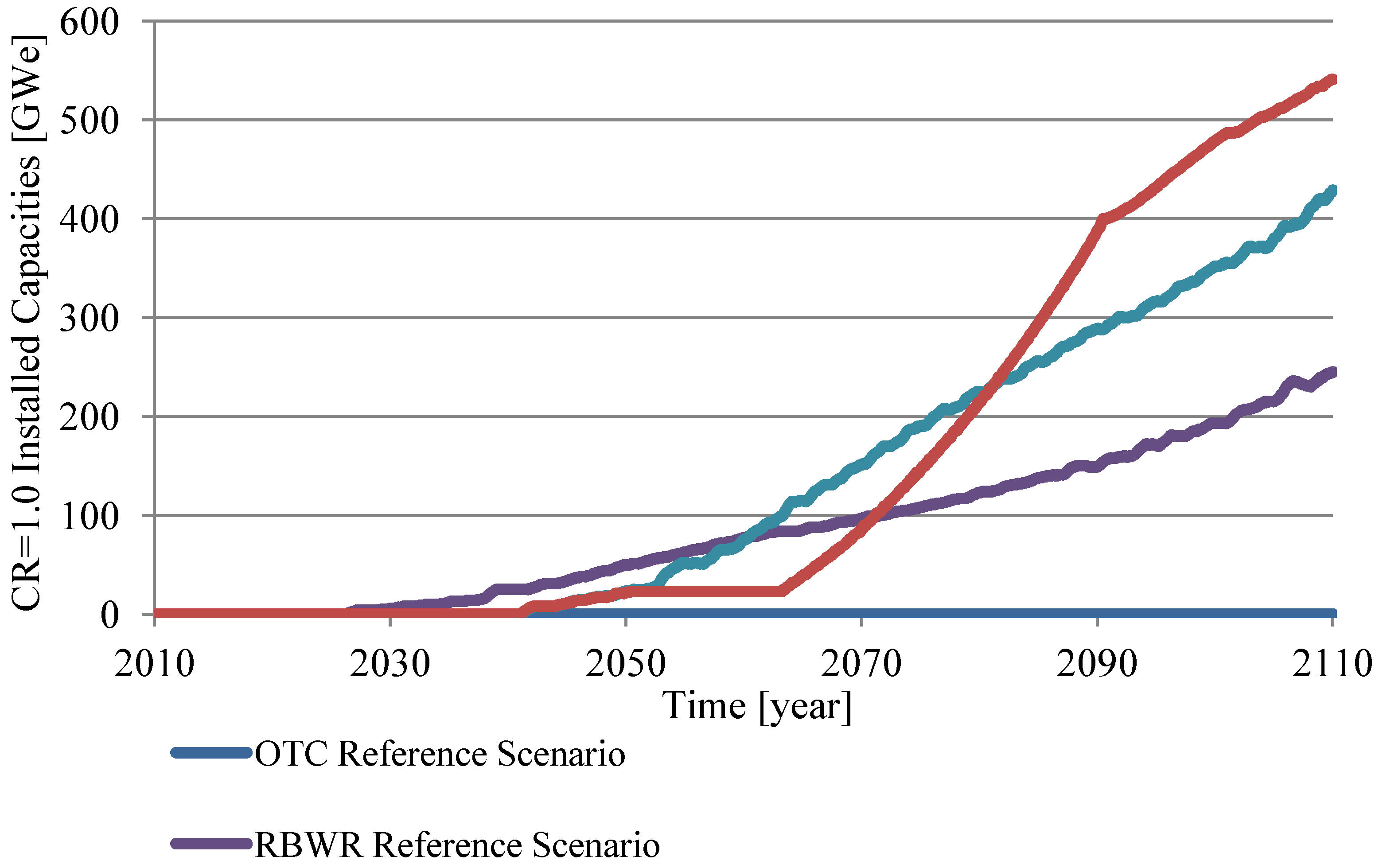 | LWR-UO2 installed Capacity (GWe) | MOX installed Capacity (GWe) | FR CR = 0.75 installed Capacity (GWe) | RBWR installed Capacity (GWe) | FR CR = 1.0 installed Capacity (GWe) | FR CR = 1.23 installed Capacity (GWe) | |||||||