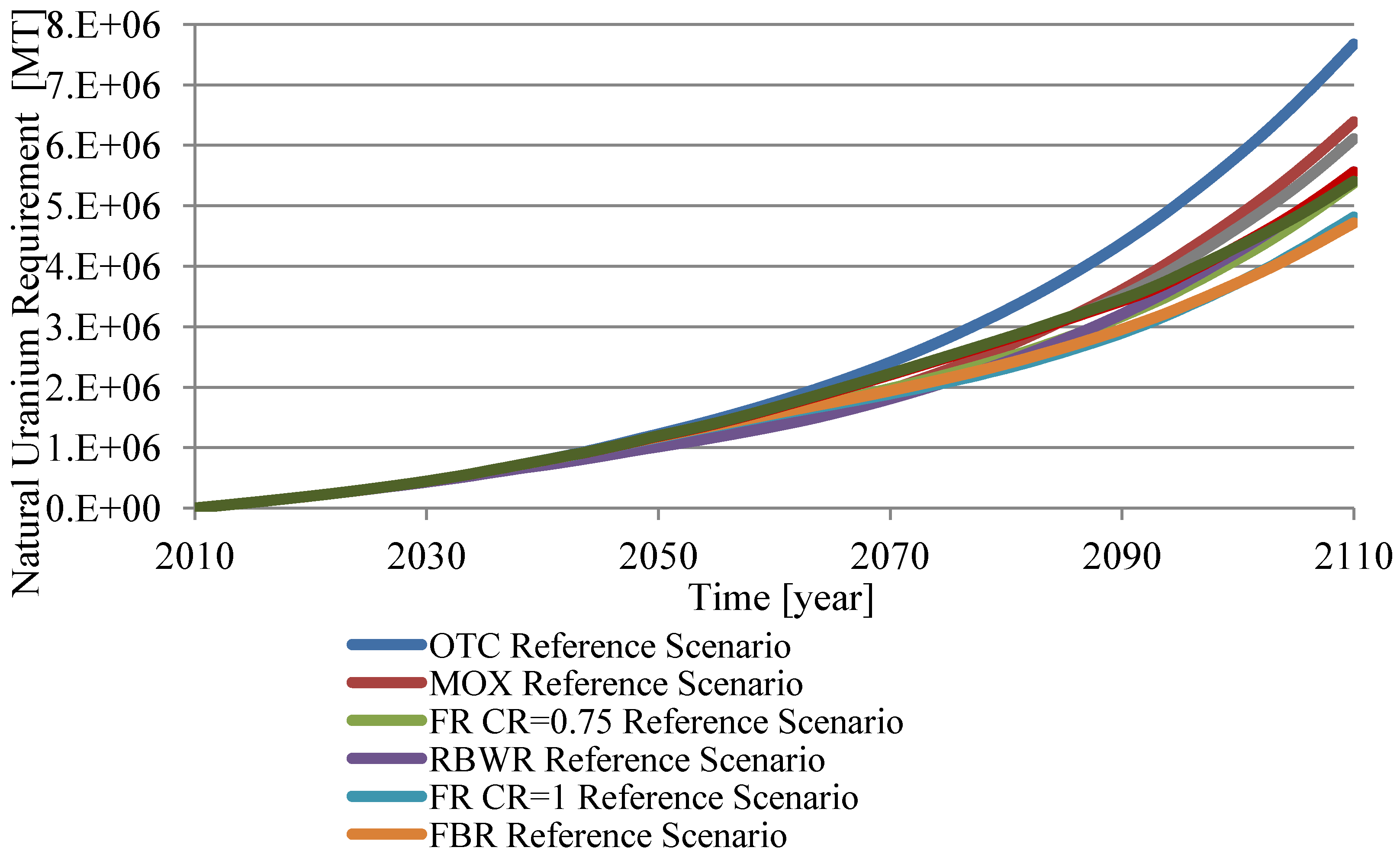 As can be seen, the introduction of recycling technologies reduces the natural uranium requirement compared to the OTC reference scenario. The introduction of U-235 initiated fast reactors reduces the natural uranium requirement compared to the OTC case, but requires more uranium than the conventionally started fast reactors which do not rely on any mined uranium.