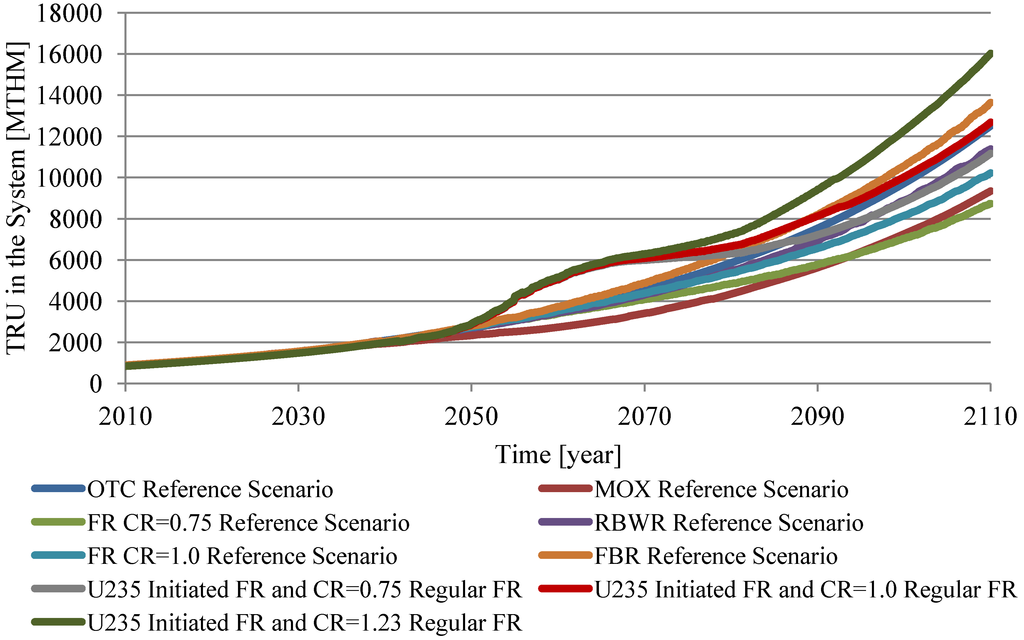 The introduction of U-235 initiated fast reactor causes the amount of TRU in the system to be larger than any of the other reference cases especially between 2040 and 2060 when U-235 initiated fast reactors are installed at a high rate. This is because of the high TRU content in the U-235 initiated fast reactor spent fuel compared to the amount of TRU in light water reactors spent fuel (see Table 4). The combination of U-235 initiated fast reactors and fast breeder reactors increases the amount of TRU by about 50% compared to the OTC cycle.