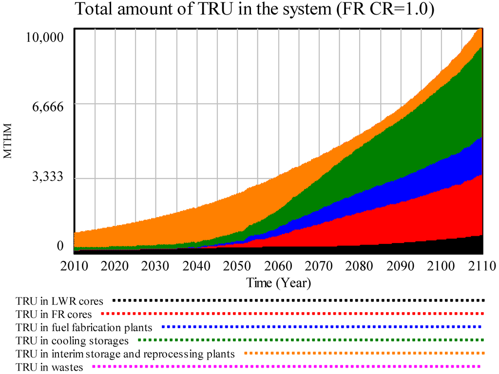 Of course the amount of TRU in the system does not tell the form or the location of TRU. Figure 11 shows the distribution of TRU for the CR = 1.0 reference scenario among reactor cores, cooling storage, interim storage, reprocessing and fuel fabrication plants and waste. As can be seen, the amount of TRU under waste form in a closed fuel cycle is extremely small, and most TRU actively stays in the fuel cycle and keeps being recycled.