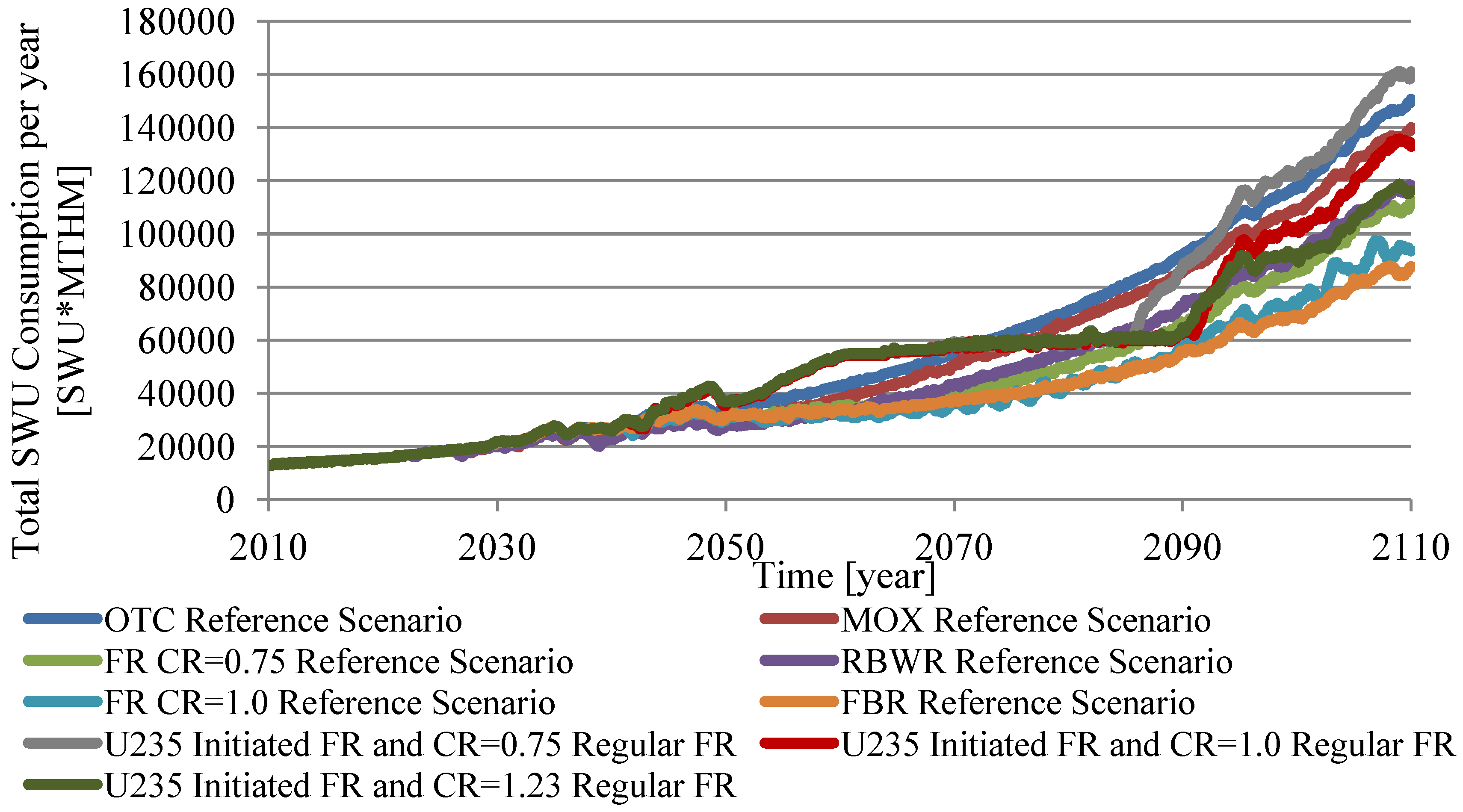 Another metric of interest is the required industrial capacity for enrichment technologies, which is also relevant to the proliferation resistance of a given nuclear fuel cycle option. Figure 12 shows the total SWU consumption per year for all the fuel cycle scenarios analyzed. The introduction of recycling technologies reduces the SWU requirement, in particular for the U-235 initiated fast reactor scenarios. However, the demand for enrichment is increasing over time in all the scenarios analyzed. In addition, the difference in the U-235 enrichment value between LWR and U-235 initiated FRs should also be separately taken into consideration, recognizing that higher U-235 enrichment also reduces the additional SWU needed to produce a significant quantity of highly enriched uranium from civilian feed stock.