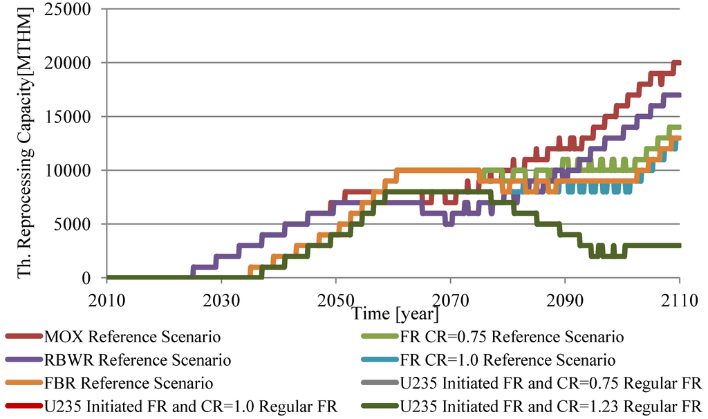 The energy growth rate is one of the key assumptions impacting the presented results and therefore the reader should be aware that assuming a significantly different energy growth rate may change the quantitative results and trends discussed in this paper. Similarly, also different assumptions on reprocessing facilities, their deployment schedule and capacity can have significant impact on the results. In this paper, thermal reprocessing facilities are characterized by a unit capacity of 1000 tHM/year, with a deployment rate limited to one plant every four years. Fast reprocessing facilities are, on the other hand, characterized by unit capacity of 500 tHM/year (for FR CR = 1.0 and FR CR = 1.23) and 200 tHM/year (for FR CR = 0.75) and a deployment rate limited to 1 plant every two years. The deployment rates were also assumed to be doubled after 2050 (for thermal reprocessing plants) and 2065 (for fast reprocessing plants).