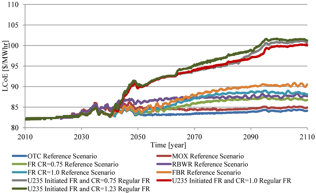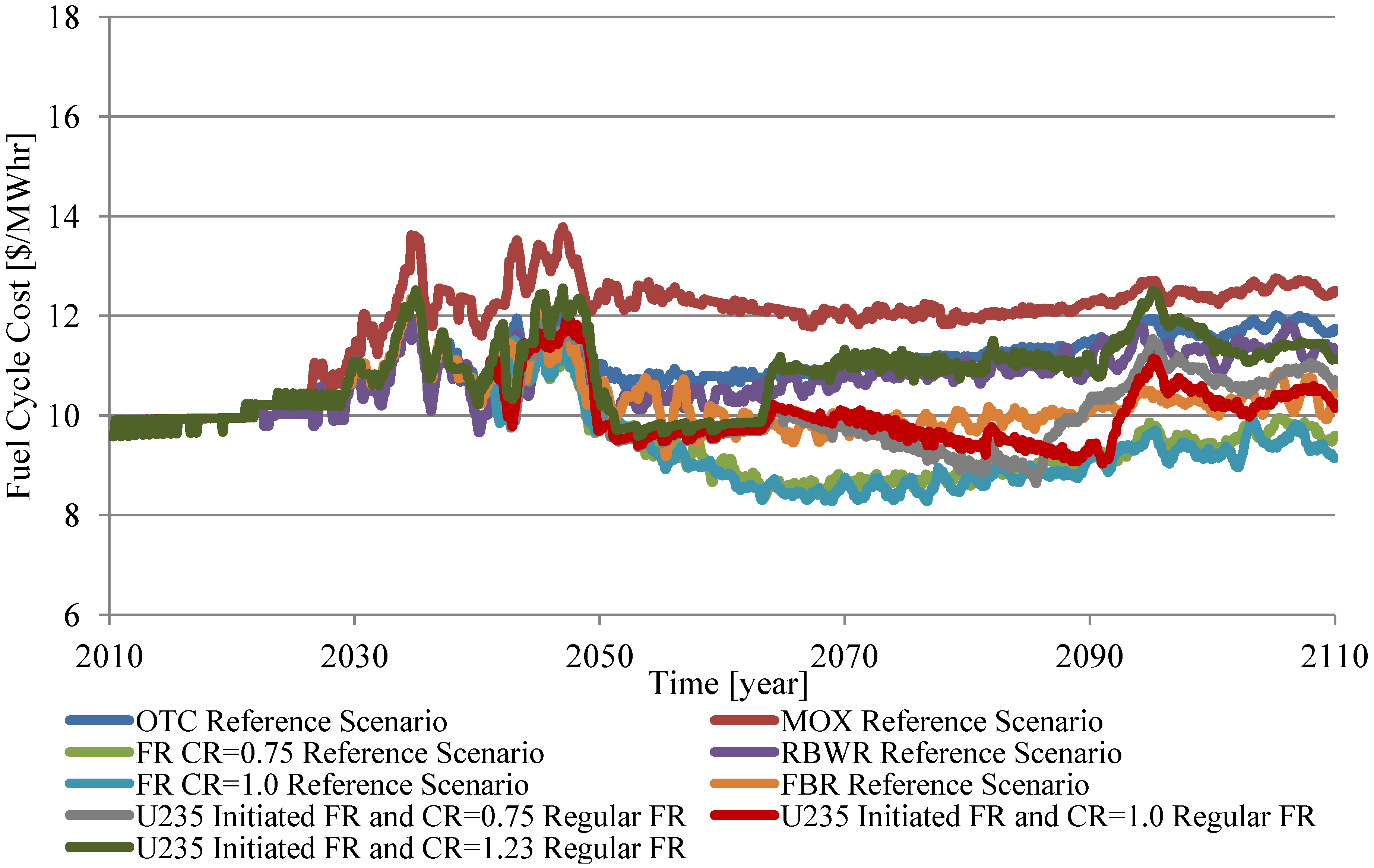 Figure 17 and Figure 18 show the dynamic levelized cost of electricity and the fuel cycle cost component of levelized cost of electricity, calculated according to the waste-base accounting scheme [11], as a function of time for all the scenarios analyzed. The main assumptions underlying this economic analysis are fully described in [9,11]. Table 7 summarizes the most relevant ones (with recycling costs included in fuel fabrication costs):