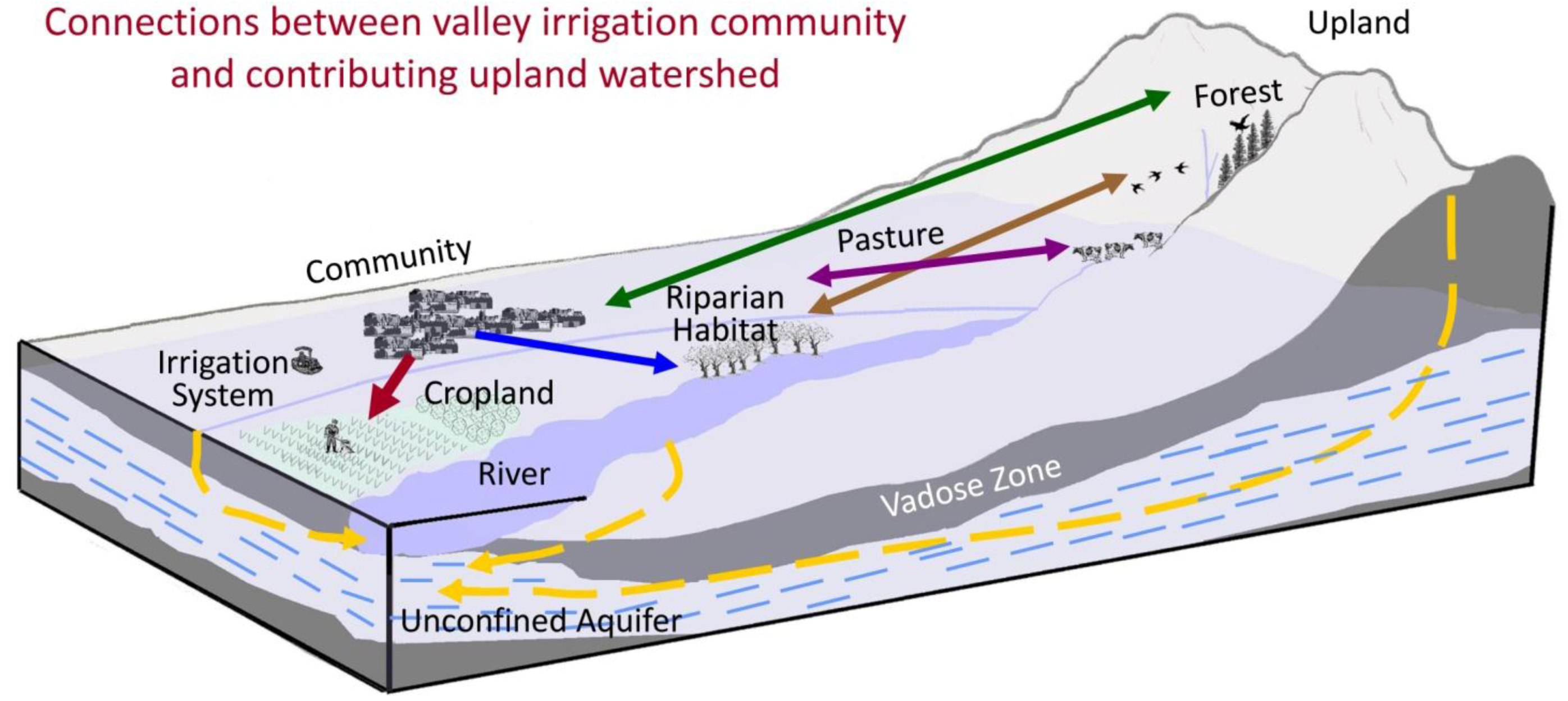 Coupled valley and upland watershed showing example connections between elements of surface and groundwater hydrology, community irrigation and land use, grazing of lowland and upland pastures, and wildlife use of valley riparian areas and upland forests.