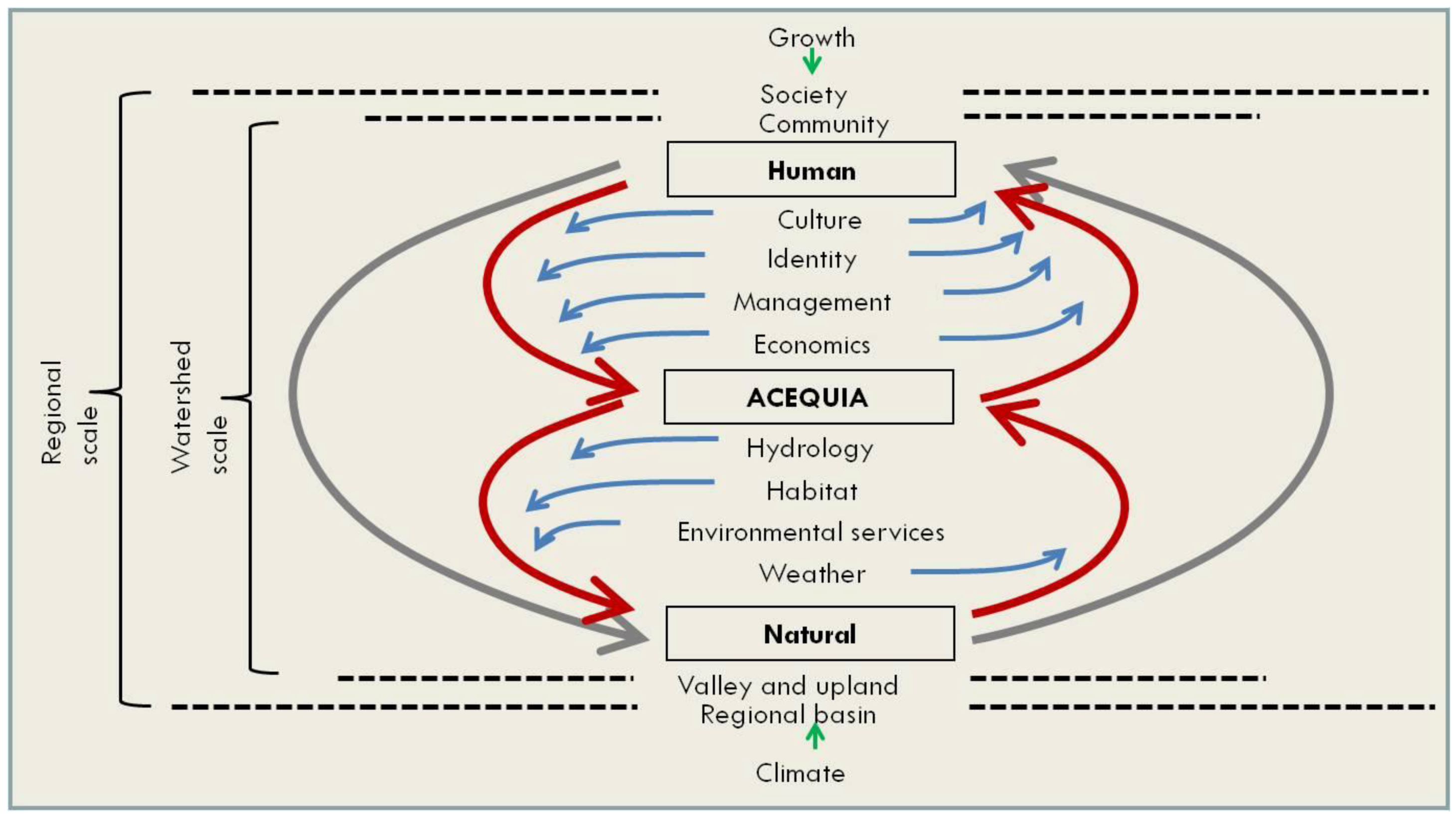 We posit that in the face of population growth and climate change, community resilience is rooted in acequia-based connectivity between natural and human subsystems. Acequia water systems link social, cultural, and economic activities and the natural phenomena occurring within the ecosystem at different scales (Figure 2). The culture, history, and traditions of these acequia systems maintain the identity of the people living in the associated communities and influence their management of land and water to sustain the local economy. In interactions between the acequia systems and natural elements, acequias buffer seasonal hydrologic variation, provide habitat for diverse species, generate ecosystem services (e.g., water quality and return flow), and are greatly affected by local and regional weather conditions (e.g., precipitation and temperature regimes).