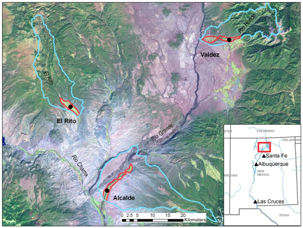 To take advantage of existing instrumentation and networks of local expertise, the interdisciplinary team is working at three detailed study sites: Rio Hondo, a tributary to the Rio Grande main stem; El Rito, a tributary to the Rio Chama and small town of the same name; and Alcalde, which is an acequia on the main stem of the Rio Grande (Figure 3) and a small town of the same name. All sites share acequia irrigation tradition, yet they differ in terms of biophysical setting, community size, linkage to uplands, distance to urbanized areas, and age of community.