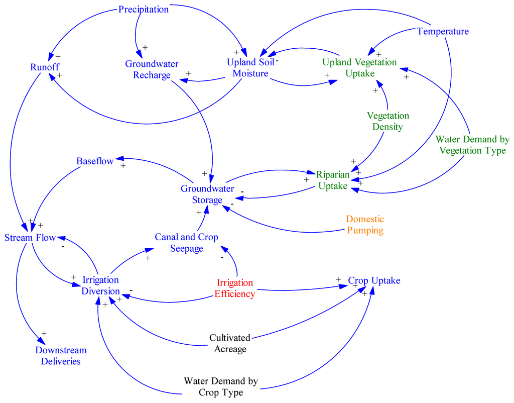 Causal loop diagrams are used to help communicate the structure of the proposed conceptual model. Causal loop diagramming is a technique for mapping the feedback within and across interacting subsystems [47]. The convention for drawing a causal loop diagram is simple, consisting of a set of variables connected by arrows denoting the causal influence. The arrow of the causal link always points from the independent variable to the dependent variable. Each causal link is assigned a polarity, either positive or negative, to indicate how the dependent variable changes when the independent variable changes (all other variables assumed constant). Below, each subsystem is described and mapped individually as a causal loop diagram. In an attempt to show interaction across subsystems, variables are color coded to their primary subsystem, blue for hydrology, green for ecosystem, red for economics and orange for social/cultural.