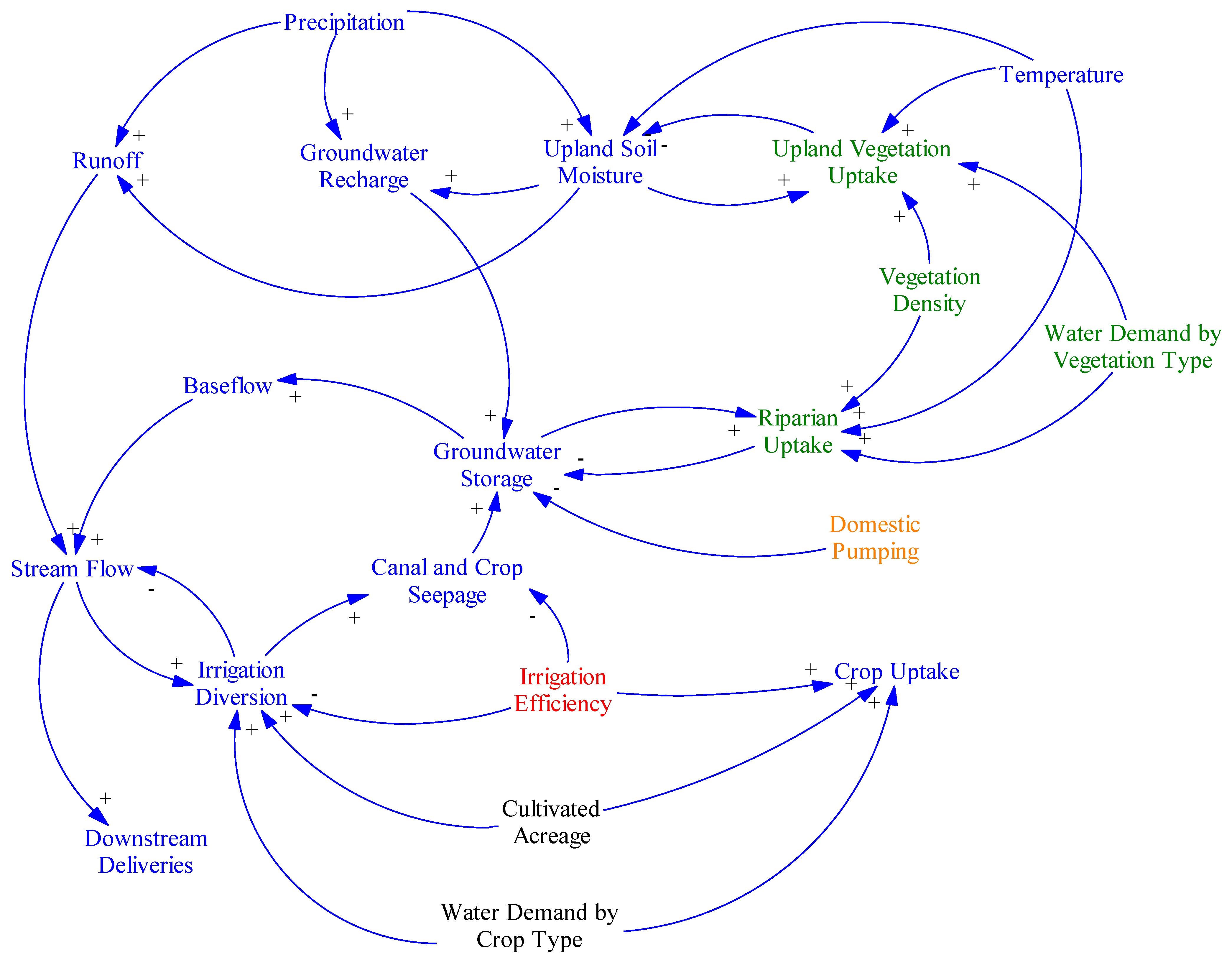 The hydrology subsystem causal loop diagram tracks the spatial and temporal distribution of four principal water stocks in each watershed, namely, surface water, groundwater, irrigation conveyance, and soil moisture (Figure 4). The primary climate variables that affect the hydrology in each watershed are temperature and precipitation. Temperature and precipitation are based on Intergovernmental Panel on Climate Change (IPCC) runs, which were downscaled to cover each of the three watersheds (Alcalde, El Rito, and Rio Hondo) in this study. The downscaled runs are adopted from the Bias Corrected and Downscaled World Climate Research Programmer’s (WCRP’s) Coupled Model Intercomparison Project phase 3 (CMIP3) climate Projections archive [50,51]. Key system outputs of the hydrology subsystem include the availability of water for domestic pumping, irrigation and upland/riparian vegetation uptake. Also of interest is total watershed water yield and delivery of water to downstream users.