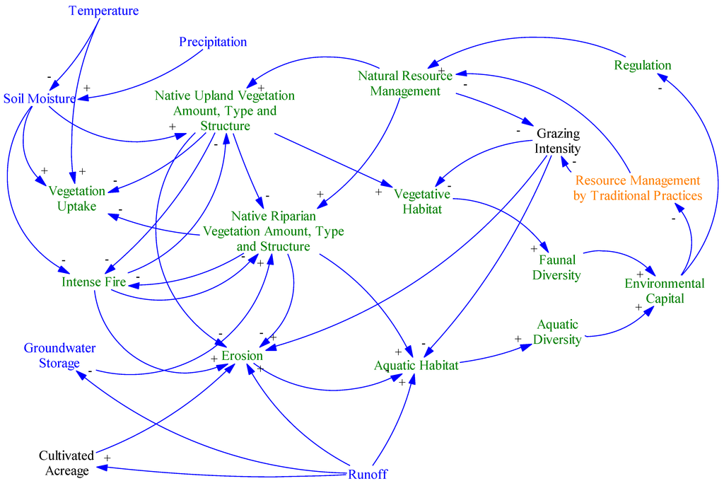 The purpose of our ongoing research effort is to investigate traditional acequia systems to identify clues to resource sustainability and identify potential adaptation strategies to help these communities persevere. Toward these goals we explore in this paper the complex interactions within this coupled human-natural system. Specifically, we posit that one cannot understand the sustainability of traditional acequia systems without detailed consideration of the interacting subsystems. To explore this tightly coupled system we construct conceptual models for each of four subsystems: hydrology, ecosystem, sociocultural, and land use/economics. Causal loop diagrams (defined below) were used by the project team to develop the conceptual models in a visual and intuitive manner. These causal loop diagrams were also used to vet the conceptual model with stakeholders from acequia communities. Characterization of local knowledge is based on ethnographic observation, self-characterization by community members themselves (including formal and informal interviews), and the ethnohistorical, ethnographic, and popular literature on New Mexican village culture [45,46]. We are, for the first time, actually trying to formulate and test these claims as hypotheses. Ultimately these causal loops and the complex systems they represent will be integrated into a system dynamics model that will help us better understand the magnitude and directionality of the different variables within each subsystem and the interactions among variables in the whole system. This integrated system dynamics model will incorporate past and present information and will be used to try and predict future conditions based on expected changes in population growth and climate variability. This system dynamics model will incorporate community and other interested stakeholder contributions and feedback throughout the entire process and ultimately will be designed to allow stakeholders and policy makers to interact with the model through a series of buttons and sliders (e.g., drought severity) that will generate likely scenarios depending on the user selections.