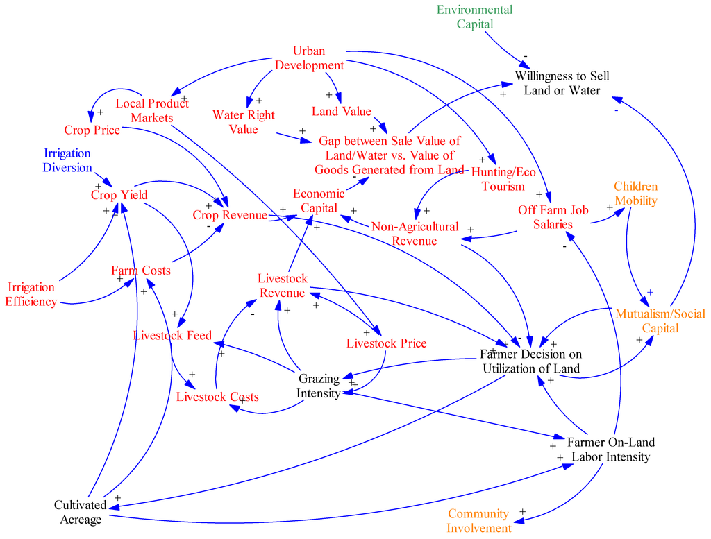 Figure 6 shows a causal loop diagram that illustrates key linkages between attributes of acequias, their members, existing economic opportunities, needed investments, and desired outcomes. Outcomes in this case not only include economic viability and sustainability, including jobs and incomes, but also cultural and environmental viability and sustainability, qualities that are also held in prominence within these rural communities. Specifically, crop and livestock decisions and activities determine the extent and intensity of land and water use, leading to both non-economic and economic outcomes. Land use decisions are shaped by prevailing economic conditions, such as product and factor prices, suitability of land to various economic opportunities, and the capabilities and characteristics of the land manager. Water uses and conservation activities are key outcomes that will feed into the hydrological system modeling and also into the ecosystem and sociocultural subsystems.