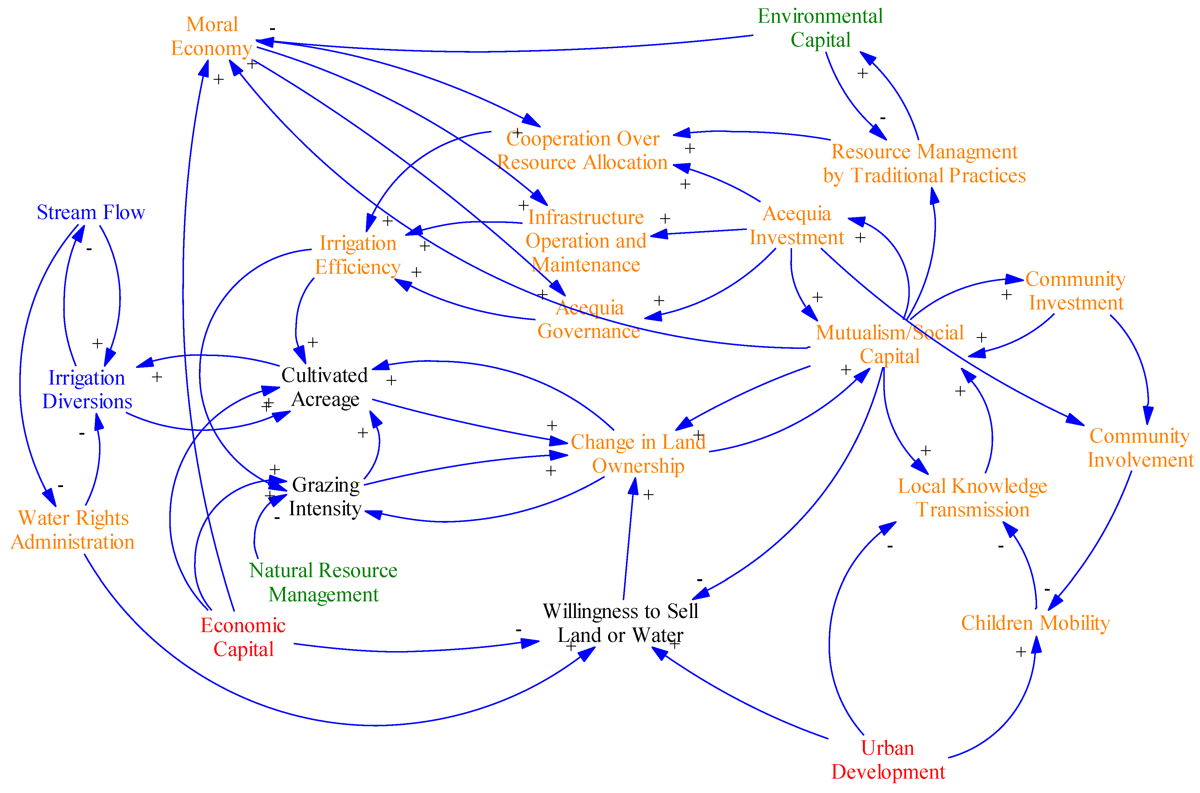 The work of the project team was then vetted with stakeholders from each acequia community [47]. Specifically, community stakeholders reviewed and evaluated project goals and objectives. Additionally they reviewed the conceptual modeling, adding valuable insight into the operations and functioning of the acequias as well as the communities they support. Ultimately this resulted in the identification of additional variables and connecting links in the causal loop diagrams. This whole process took about 6 months, and was an extremely valuable exercise in practical interdisciplinary research, drawing on the strengths of each discipline while finding previously unidentified linkages between the subsystems.