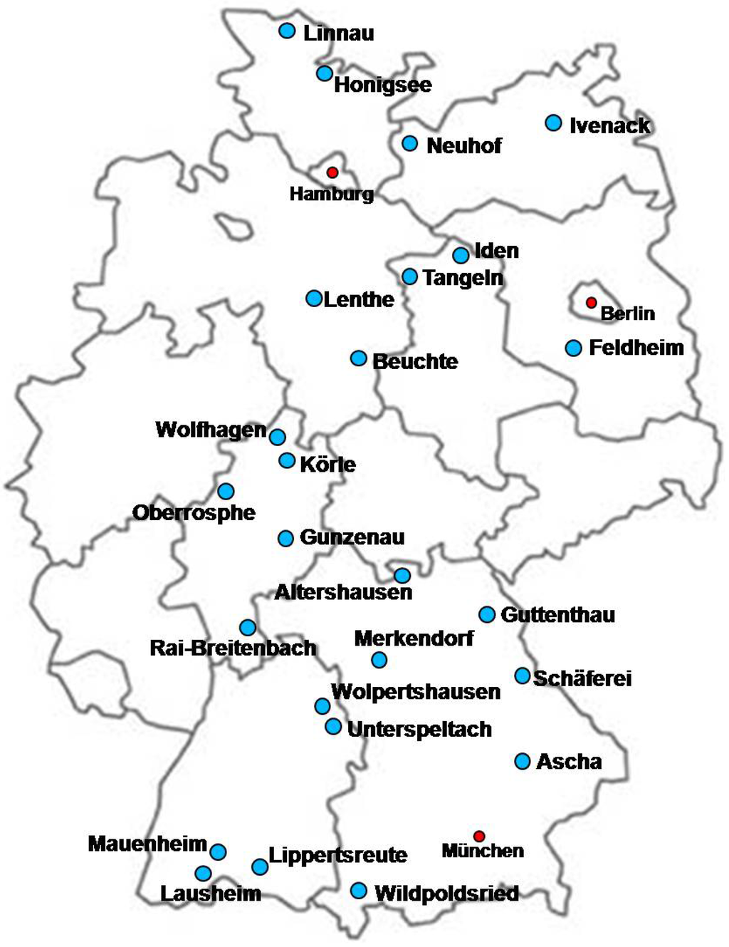 The interview study was conducted in 20 bioenergy villages and 5 “integrative” communal bioenergy projects (which combine bioenergy use with other renewable energy sources) between June 2009 and March 2010 (see Figure 1). The 25 investigated communal renewable energy projects were selected according to two criteria: On the one hand, we wanted to achieve a wide variation over many regions in Germany, to derive representative results from the interviews. On the other hand, the implementation of the projects has to be finished at least one year. The date of the project’s realization ranged between the years 1994 (Altershausen) and 2008 (Tangeln). The investigated projects were chosen after an intensive internet and literature search.