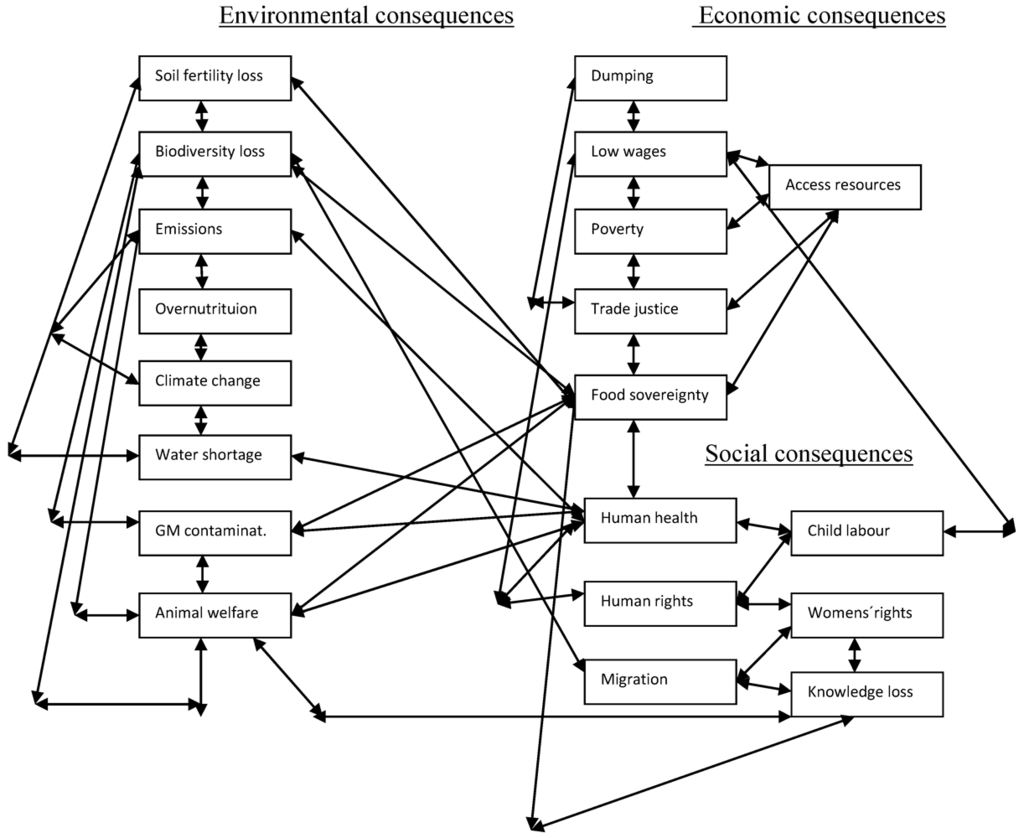 The concept of sustainable development embraces consumption- and production-related integrated consequences of food that are economic, social and environmental [13]. In this paper, sustainability-related consequences of food production are described as environmental, economic and socio-cultural. In the case of economic consequences, only indirect effects are described, i.e. economic effects not directly related to the financial transaction of selling/buying food. Thus, the price of food, however important for sustainable food provisioning, is not included as an economic consequence of food production, but rather its effect in terms of poverty and hunger, two issues that are related to the socio-cultural and environmental aspects of food production.
