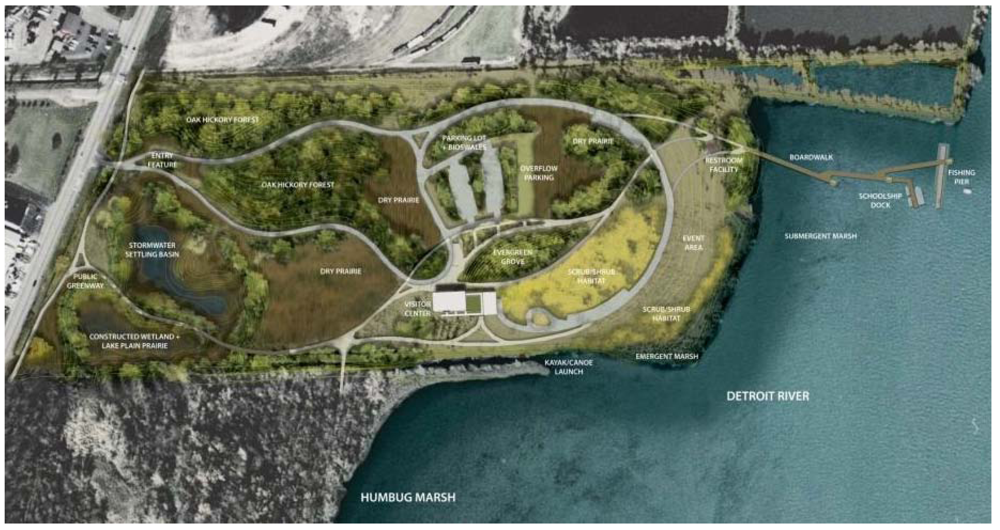 In 2003, Wayne County initiated a master planning process for the Refuge Gateway that was completed in 2004 (Figure 3). The goal of the master plan was to be a model of sustainable redevelopment by providing a blueprint for the cleanup and restoration work necessary to establish the site as an ecological buffer for Humbug Marsh and to encourage public uses. Everything people would see and do at the Refuge Gateway would teach them how to live sustainably. Further, the site would be integrated with Humbug Marsh in a fashion that would help Wayne County, the U.S. Fish and Wildlife Service, and other partners teach the next generation of conservationists and sustainability entrepreneurs.