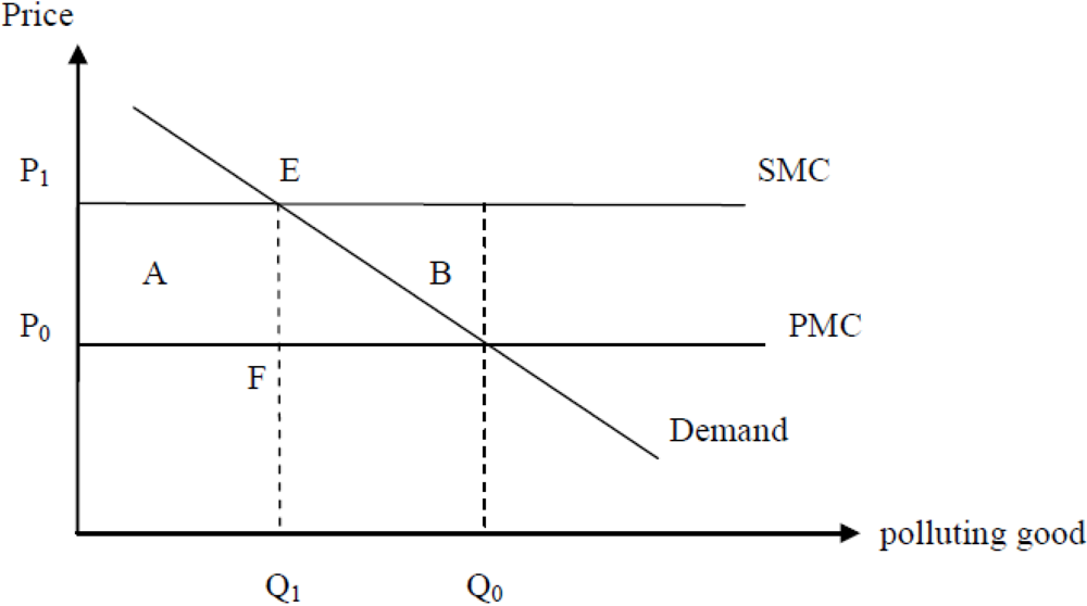 Figure 1 illustrates this result. Without an environmental tax, the equilibrium quantity of the polluting good would be Q0, where the private marginal cost curve (PMC) intersects the demand (which reflect the social marginal benefit of consuming the good). This exceeds the efficient level Q1, which is the quantity at which the social marginal cost curve (SMC) intersects with the demand curve. This generates a deadweight loss for the economy, given by the triangle area B. If an environmental tax is imposed with a tax rate equal to (P1− P0) (i.e., the distance between E and F), the new equilibrium would be at the quantity Q1. Thus, the environmental tax would internalize the negative externality and increase the welfare of the economy by area B (see, for example, Fullerton et al. [12]). The revenue generated by the tax in this case is the rectangle area A.