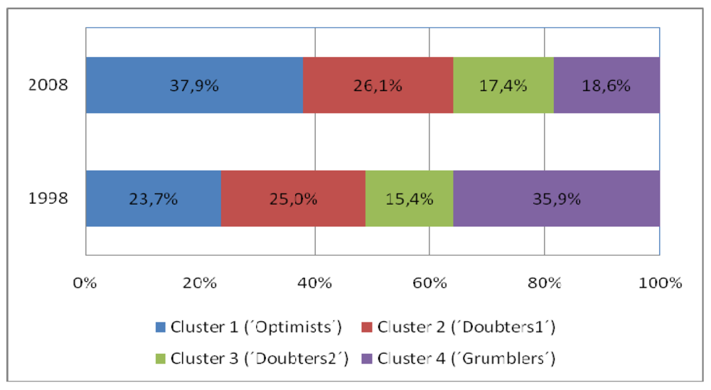 | Cluster 1 (‘Optimists’) | Cluster 2 (‘Doubters1’) | Cluster 3 (‘Doubters2’) | Cluster 4 (‘Grumblers’) | Total | |