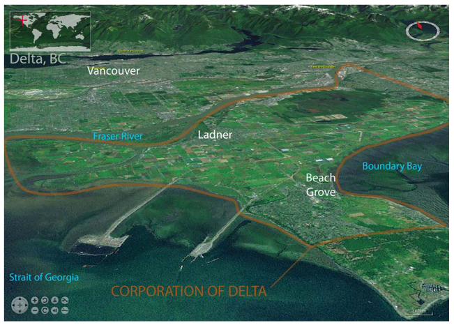 Ladner and Boundary Bay, locales in the Corporation of Delta, within the coastal Metropolitan Vancouver area [8].