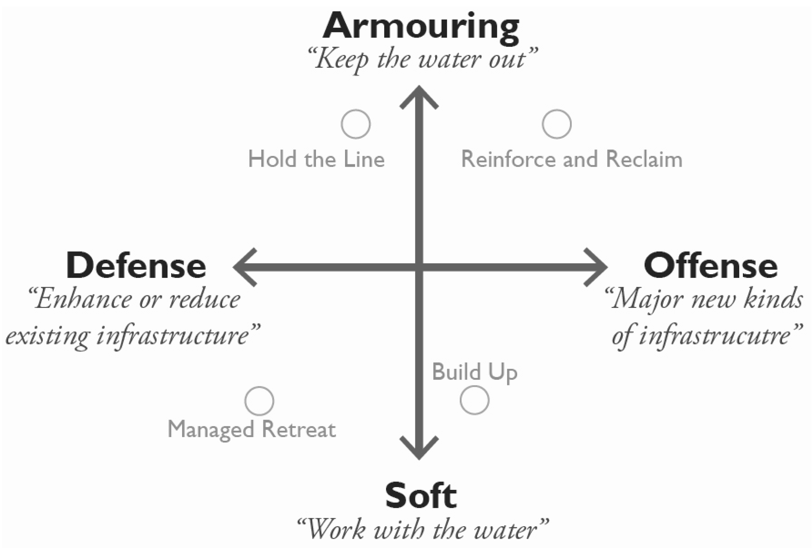 In this framework, the adaptation scenarios can be compared by the extent to which they defend or take offensive action, and armor or use softer approaches against sea level rise [35].