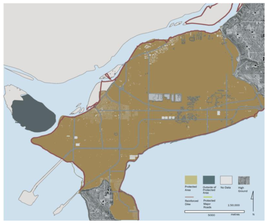 - Flanders, D.; Barron, S.; Pond, E.; Canete, G.; Tatebe, K.; Carmichael, J.; Cohen, S.J.; Muir-Owen, S.; Sheppard, S.R.J. Delta-RAC Sea Level Rise Adaptation Visioning Study Technical Report; University of British Columbia: Vancouver, Canada, 2012. [Google Scholar]