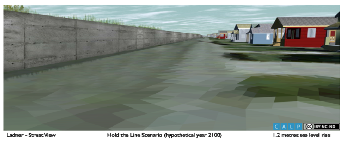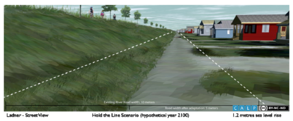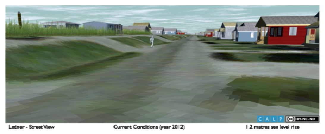 The BC Ministry of Environment recommended dike crest elevations and flood levels that were used to produce the visualizations (see Table 2). The team chose to model seawalls in Boundary Bay at 6.9 meters above mean sea level, as recommended in the guidelines. The dikes in Ladner are modeled one meter lower at about 5.9 meters, as recommended by experts, because Ladner would not experience the same intensity of waves and storm surges (communication with stakeholder coastal engineer). Generally, the imagery shown for South Delta was received with skepticism on the efficacy and acceptability of this strategy being implemented there. In Ladner, the imagery prompted discussion on the detailed qualities/design that would make this strategy feasible, such as by re-routing traffic from a narrow River Road, or providing public amenities such as a greenway atop the raised dike. Hold the Line is visualized in Ladner and South Delta in Figure 5–Figure 8.